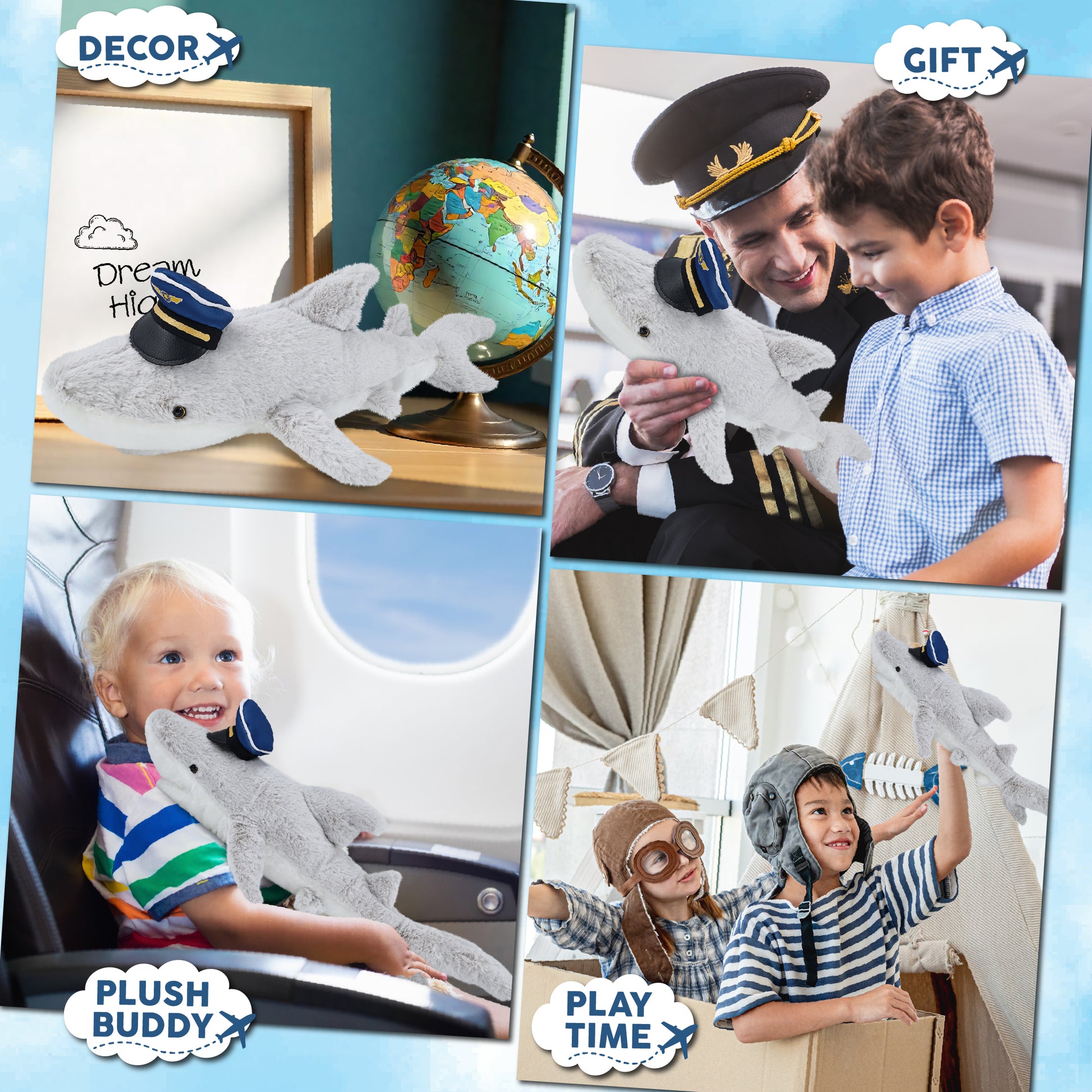 The Pilot Stuffed Shark Plush is Perfect for Aviation Lovers - Everyone who loves aviation will be thrilled to have a pilot stuffed shark, whether it’s a cute stuffed animal gift or a cute teddy bear plush for aviation-themed collections. Perfect pilot fluffy stuffed animal for flight pretend play and as a pilot shark toy gifts for kids who aspire to be pilots when they grow up. Recommended for ages 3 and up.