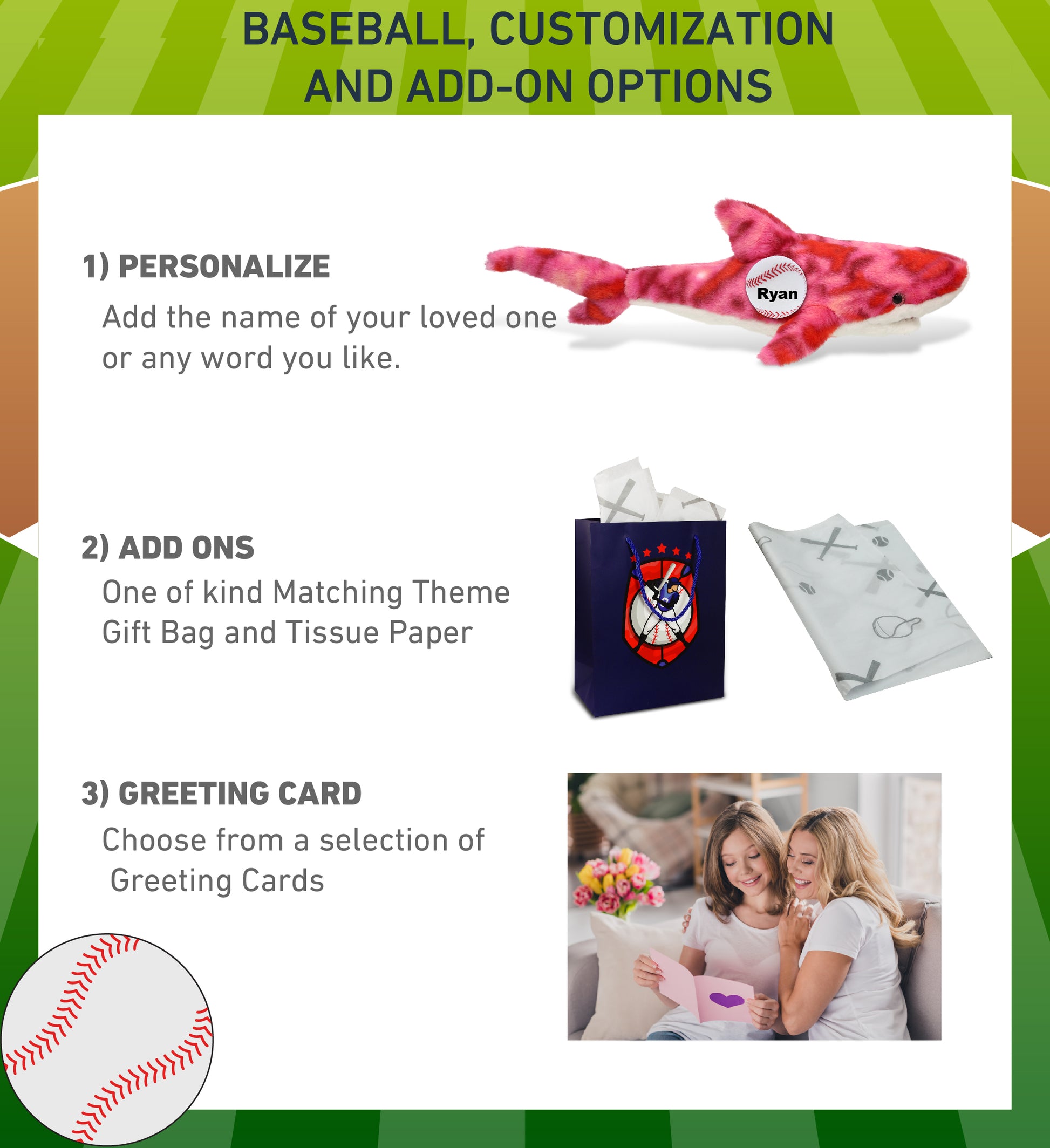 Personalization, Customization, and Add-On Options - The Super Soft Sports Stuffed Animal Pink Tie-Dye Shark comes customized with a small baseball plush. You can personalize your stuffed animal shark with the name of your loved one which we will imprint on the item. You also have the option to add some or all of the cool add-ons to make your gift extra special: 1) Gift Bag; 2) Tissue Paper; 3) Greeting Card.