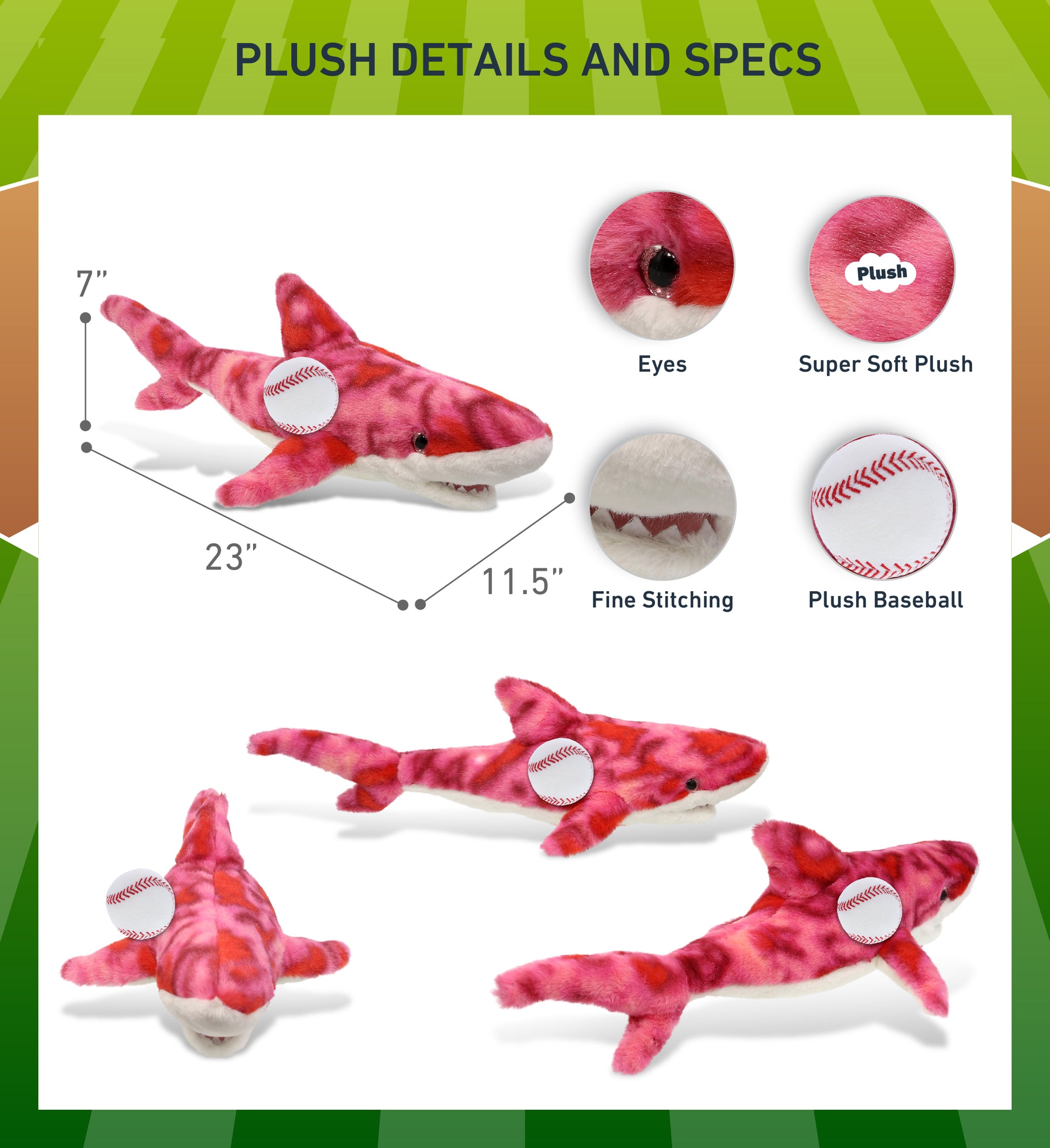 Included with The Purchase of Shark Plush with Baseball Ball - Includes 1 DolliBu Pink Tie-Dye Shark Super Soft Stuffed Animal with a baseball plush, decorated with realistic features of a shark. The baseball sports ball is attached to the shark's body, making it perfect for cuddles. The shark plush toy features realistic details. The shark's eyes make the critter so charming. The cute plush toy buddy measures 23Lx11.5Wx7H inches.