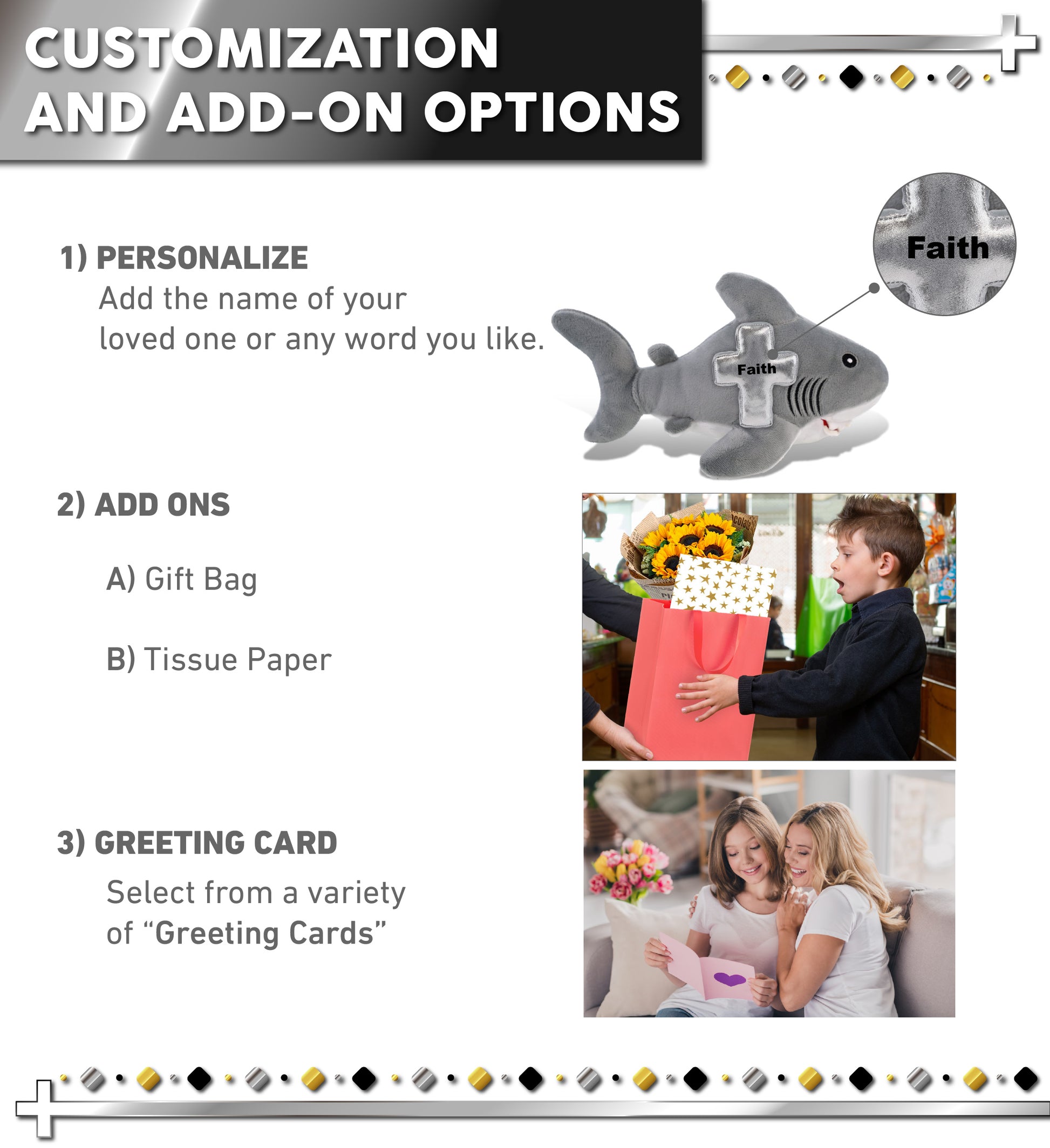 Personalization, Customization, and Add-On Options - Super Soft Eco-Friendly Shark stuffed animal bear comes customized with a shiny metallic cross. You can turn it into a personalized teddy bear with the name of a loved one, or add any word which we will imprint on the item. And last, you have the option to add some or all of the cool add-ons to make your gift extra special: 1) Gift Bag 2) Tissue Paper 3) Greeting Card.