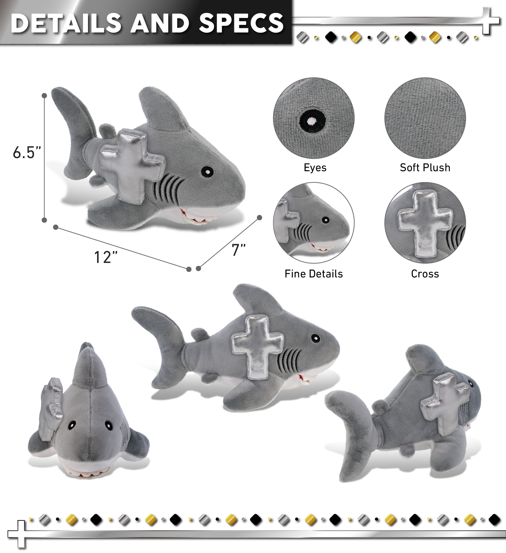 Included in the Purchase of Stuffed Animal Soft Eco-Friendly Shark Plush - Includes 1 DolliBu Eco-Friendly Shark stuffed doll toy perfect to celebrate a holy occasion. The Eco-Friendly Shark plush bear for baby comes with a metallic silver cross plush figure attached to the shark's body. Decorated with grey plush, realistic design, and soft fabric perfect for cuddles and snuggles. Baby dedication gift shark's size is 12Lx7Wx6.5H inches.