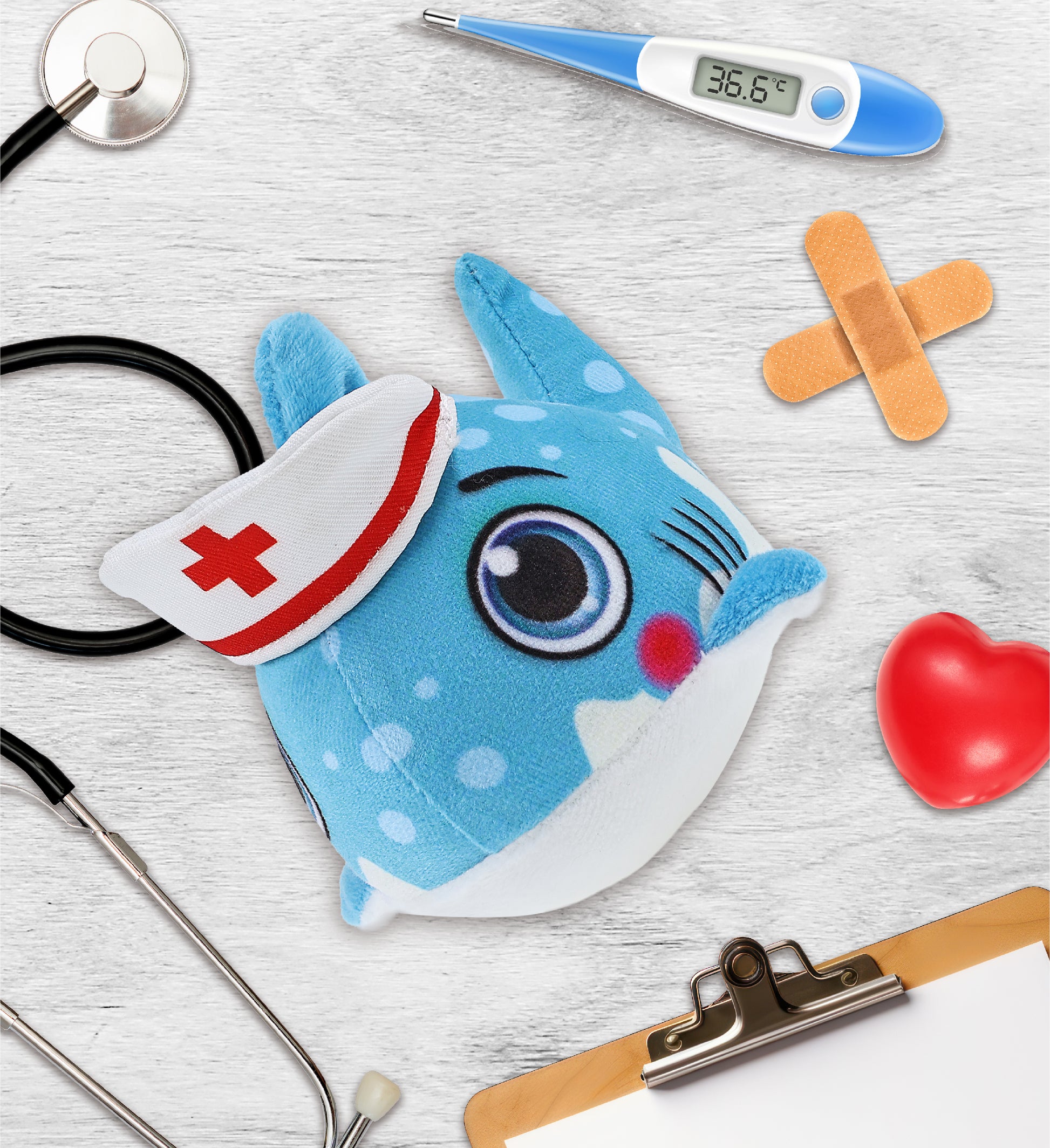 If you're looking for cute hospital gifts for kids, get well shark for your friend, or a shark teddy bear in costume, this shark doll with nurse hat brings a playful vibe to any occasion. Ideal hospital gifts for children to make them feel safe, or as medical toys for kids to inspire them at a young age. The perfect stuffed animal shark for nurses and for creative storytelling. The stuffed shark nurse hospital toy features a classic nurse hat. Designed with a red cross against the white nurse cap, it adds charm and style. The shark plush has soft plush, perfect for everyday cuddles and snuggles. This stuffed animal shark makes the perfect addition to your collection of shark teddy bear with clothes or giveaway hospital toys to give to sick children. The super soft shark plush comes with a cute nurse hat. Make your nurse teddy bear stuffed animal shark plush special by adding a personalized name, which we'll imprint onto the plush. You can also customize your nurse shark plush by adding any of our add-ons to create the perfect gift: 1) Gift Bag 2) Tissue Paper 3) Greeting Card. This cute stuffed animal shark plush nurse is crafted with soft, durable polyester materials. The shark nursing stuffed animal is built to last endless cuddles. The nurse hat is carefully stitched to the shark plush to ensure it stays secure during playtime. Its soft yet sturdy design makes this shark plush nurse a comforting companion for kids and collectors. Includes 1 DolliBu Plush Buddies Shark Plush with Nurse Outfit - It comes with a cuddly stuffed animal shark plush in a classic nurse hat, complete with a white nurse cap with a red cross printed in front. This shark toy with a nurse teddy bear white nurse cap is perfect for role-playing or plush gifts for someone who is sick for them to feel cared for. It measures 6Lx5Wx4.5H inches. This plush shark is ideal for kids ages 3 and up.