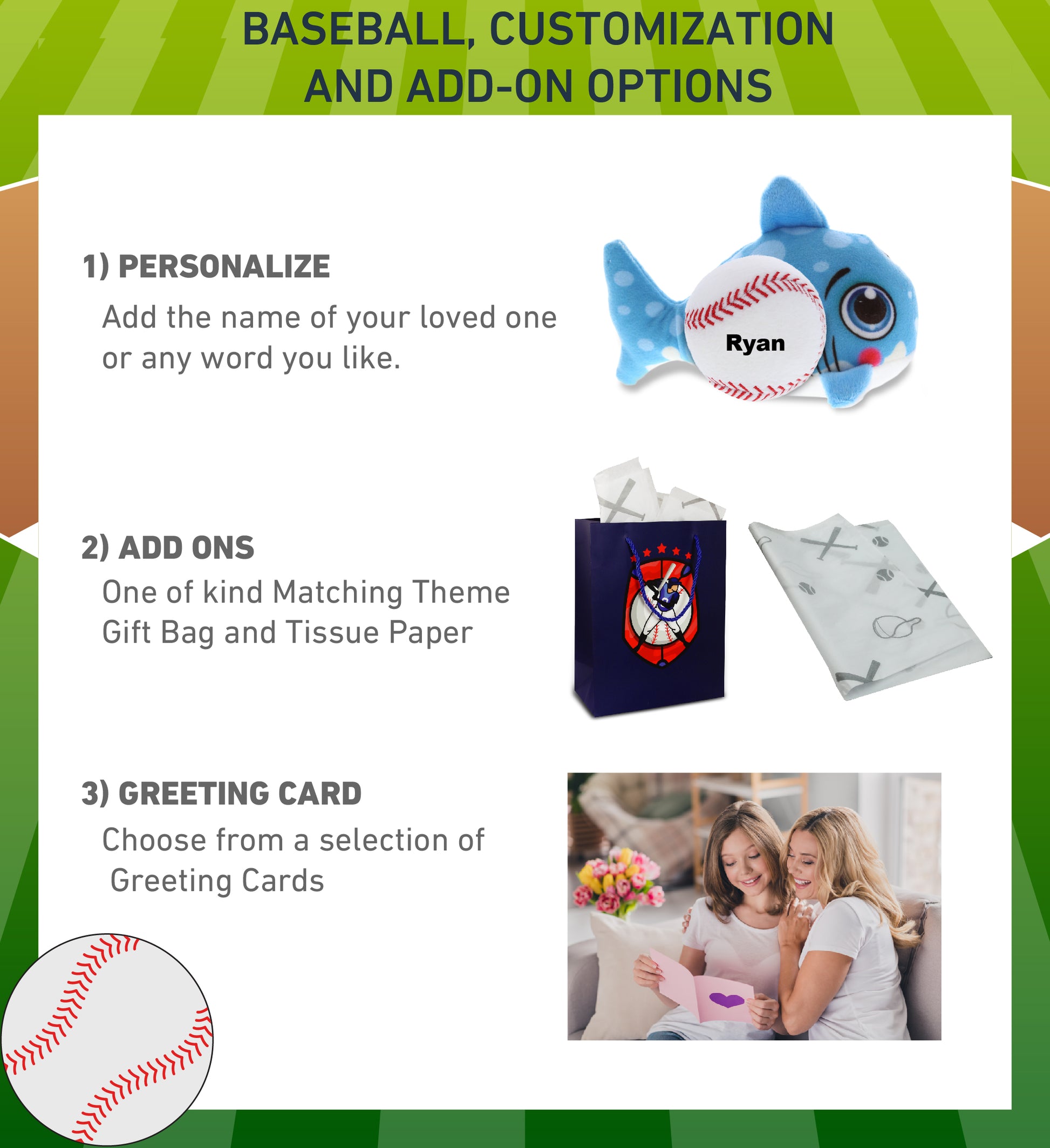 Personalization, Customization, and Add-On Options - The Super Soft Sports Stuffed Animal Shark comes customized with a small baseball plush. You can personalize your stuffed animal shark with the name of your loved one which we will imprint on the item. You also have the option to add some or all of the cool add-ons to make your gift extra special: 1) Gift Bag; 2) Tissue Paper; 3) Greeting Card.