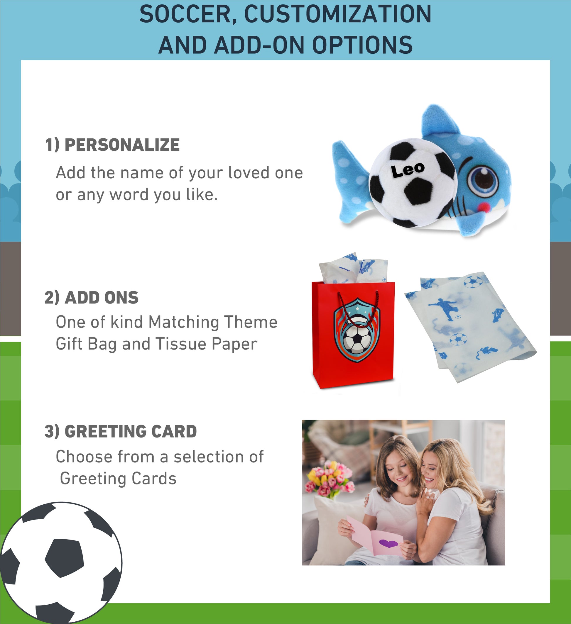 Personalization, Customization, and Add-On Options - Plush Buddies Shark sports stuffed animal comes customized with a Soccer Ball Plush. You can personalize your shark plush with the name of your loved one imprinted on the item. You also have the option to add some or all of the cool add-ons to make your gift extra special: 1) Gift Bag; 2) Tissue Paper; 3) Greeting Card.