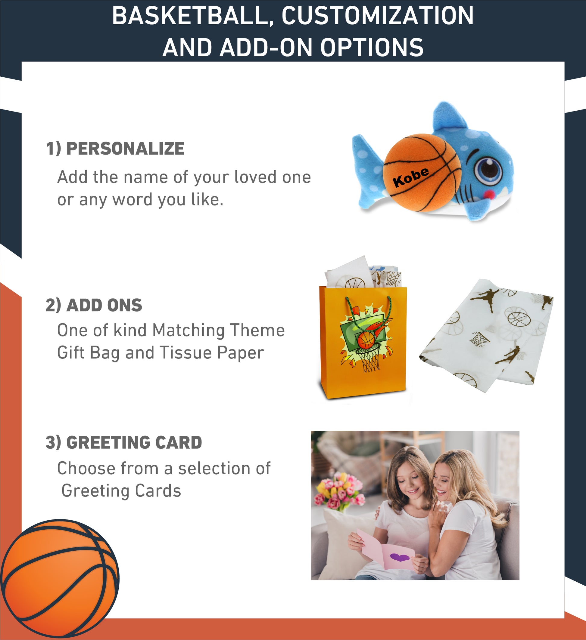 Personalization, Customization, and Add-on Options - The Super Soft Sports Stuffed Animal Plush Buddies Shark comes customized with a basketball plush. You can personalize your shark plush toy with the name of your loved one, which we will imprint on the item. You also have the option to add some or all of the cool add-ons to make your plush gift extra special: 1) Gift Bag; 2) Tissue Paper; 3) Greeting Card.