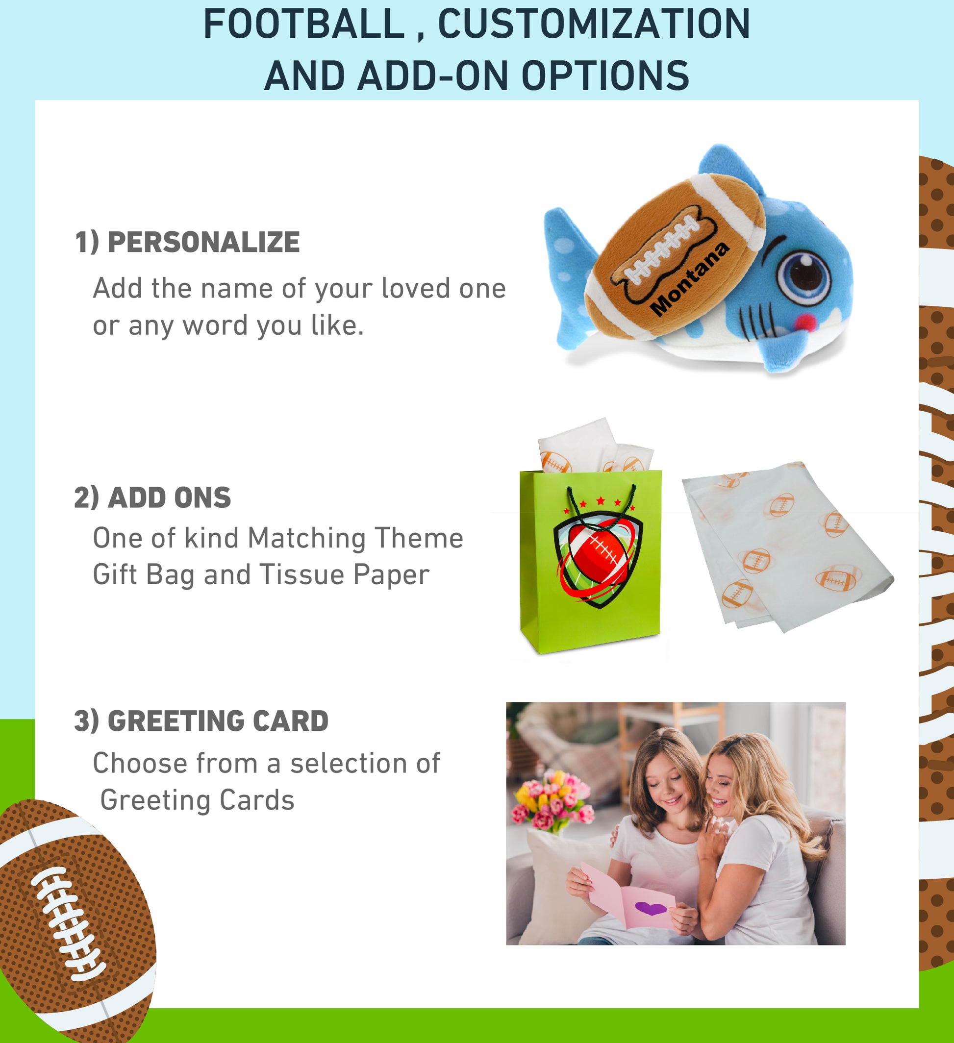 Personalization, Customization, and Add-On Options - Super Soft Sports Stuffed Animal Plush Buddies Shark comes customized with a football plush. You can personalize it with the name of your loved one imprinted on the item. You also have the option to add some or all of the cool add-ons to make your gift extra special: 1) Gift Bag; 2) Tissue Paper; 3) Greeting Card.