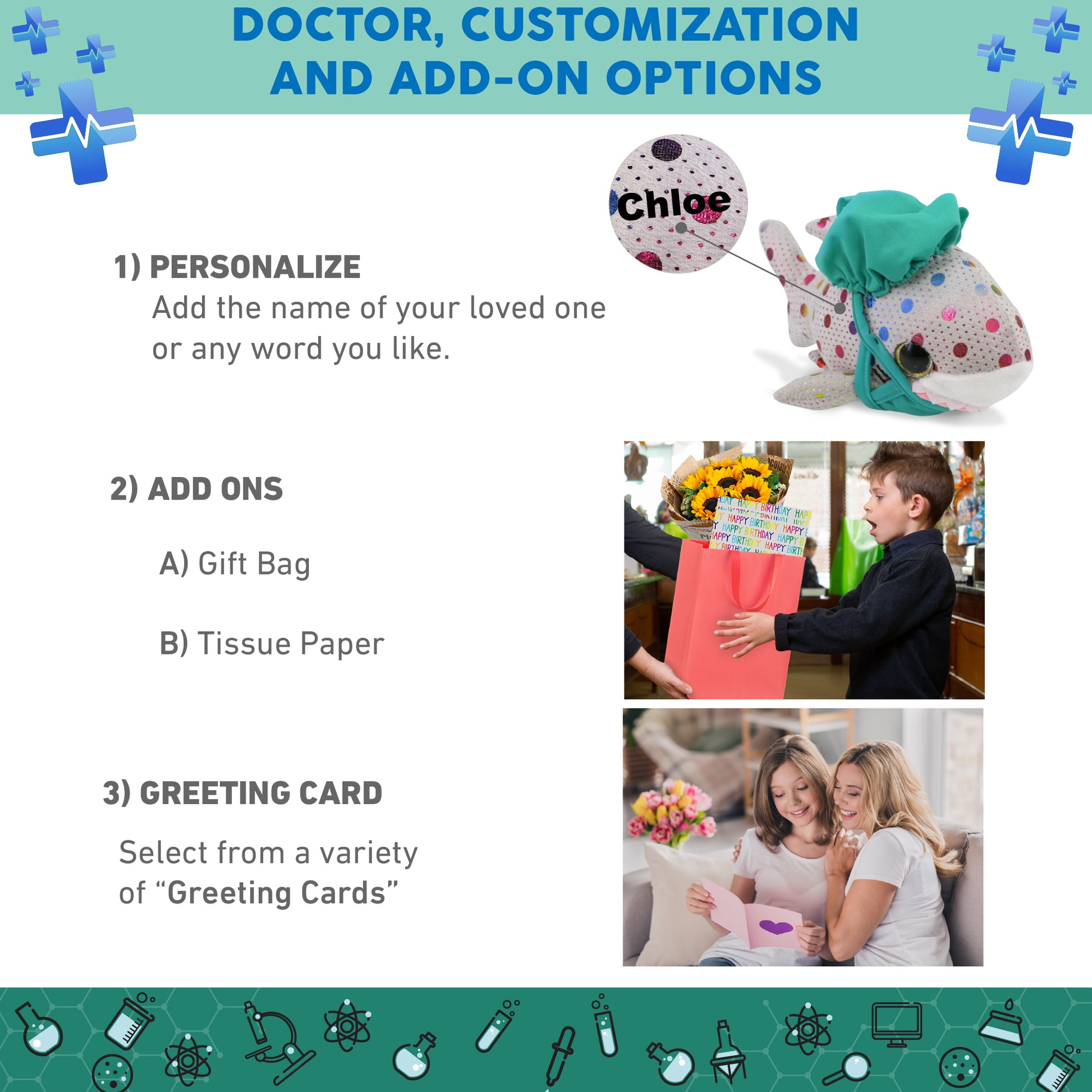 Personalization, Customization, And Add-On Options - Super Soft Big Eye Dotted Shark Doctor Plush comes customized with a doctor's uniform scrub cap and face mask. You can personalize it with the name of your loved one imprinted on the item. You also have the option to add some or all of the cool add-ons to make your gift extra special: 1) Gift Bag; 2) Tissue Paper; 3) Greeting Card.