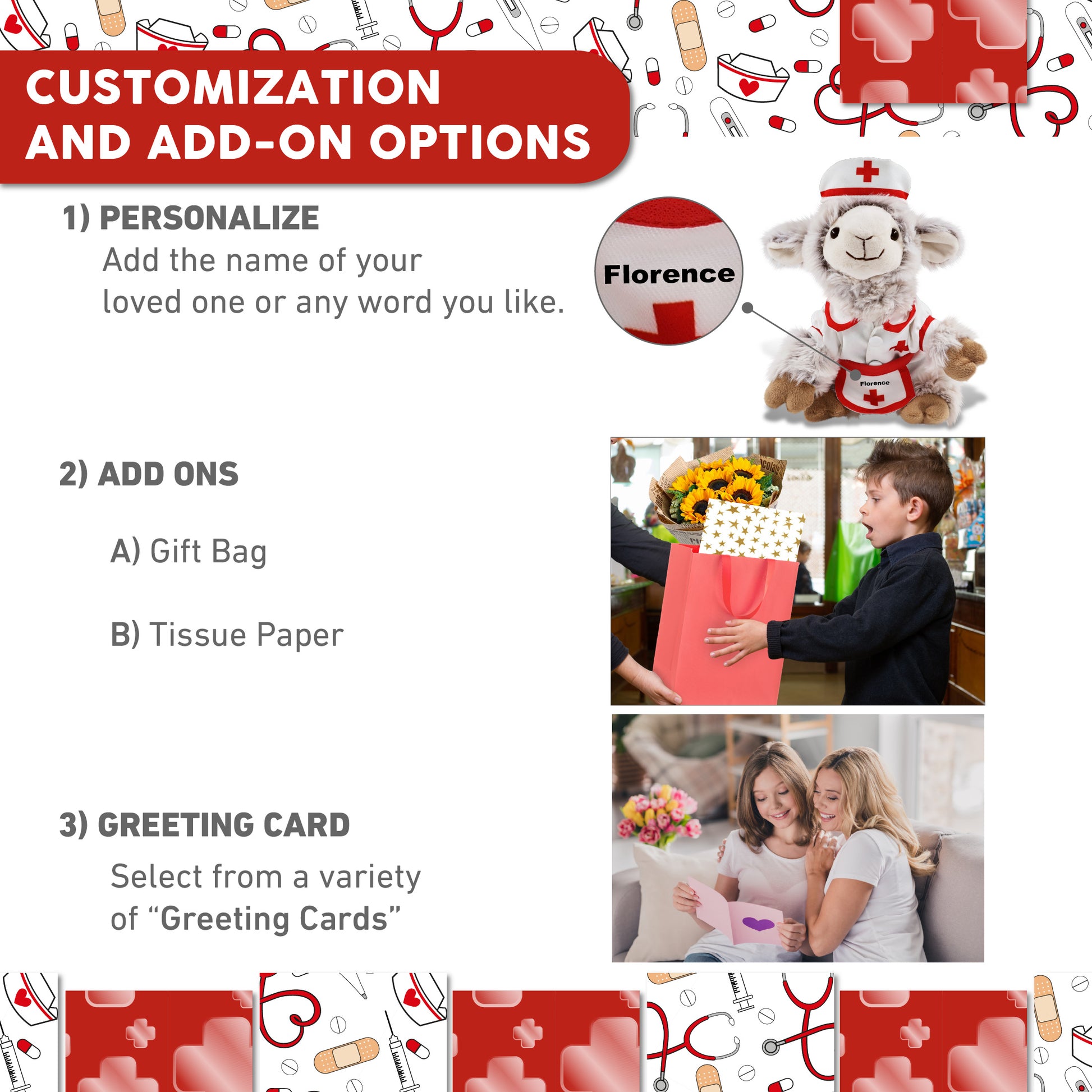 Personalization, Customization, and Add-On Options - The stuffed sheep comes dressed in a cute nurse costume, complete with nurse cap, nurse dress and apron. Make your nurse teddy bear stuffed animal plush special by adding a personalized name, which we'll imprint onto the plush. You can also customize your nurse sheep plush by adding any of our add-ons to create the perfect gift: 1) Gift Bag 2) Tissue Paper 3) Greeting Card.