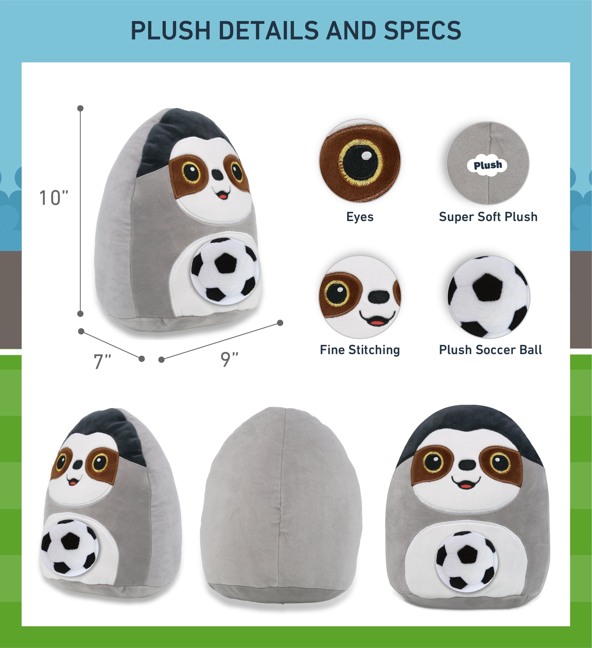 Included with the Purchase of the Cute Super Soft Sloth Plush - Includes 1 DolliBu Snug-Mooshies Sloth Super Soft Plush with a soccer ball plush, decorated with realistic features. The sloth's body with a sports gift ball plush makes the plush perfect for cuddles. The sloth plush toy features details like its characteristic eyes. The sloth's eyes make the critter so charming. The cute sloth plush toy buddy measures 9Lx7Wx10H inches.