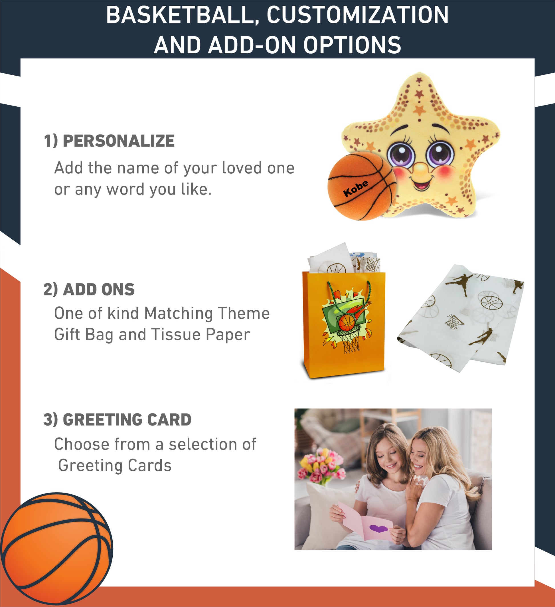 Personalization, Customization, and Add-on Options - The Super Soft Sports Stuffed Animal Plush Buddies Starfish comes customized with a basketball plush. You can personalize your starfish plush toy with the name of your loved one, which we will imprint on the item. You also have the option to add some or all of the cool add-ons to make your plush gift extra special: 1) Gift Bag; 2) Tissue Paper; 3) Greeting Card.