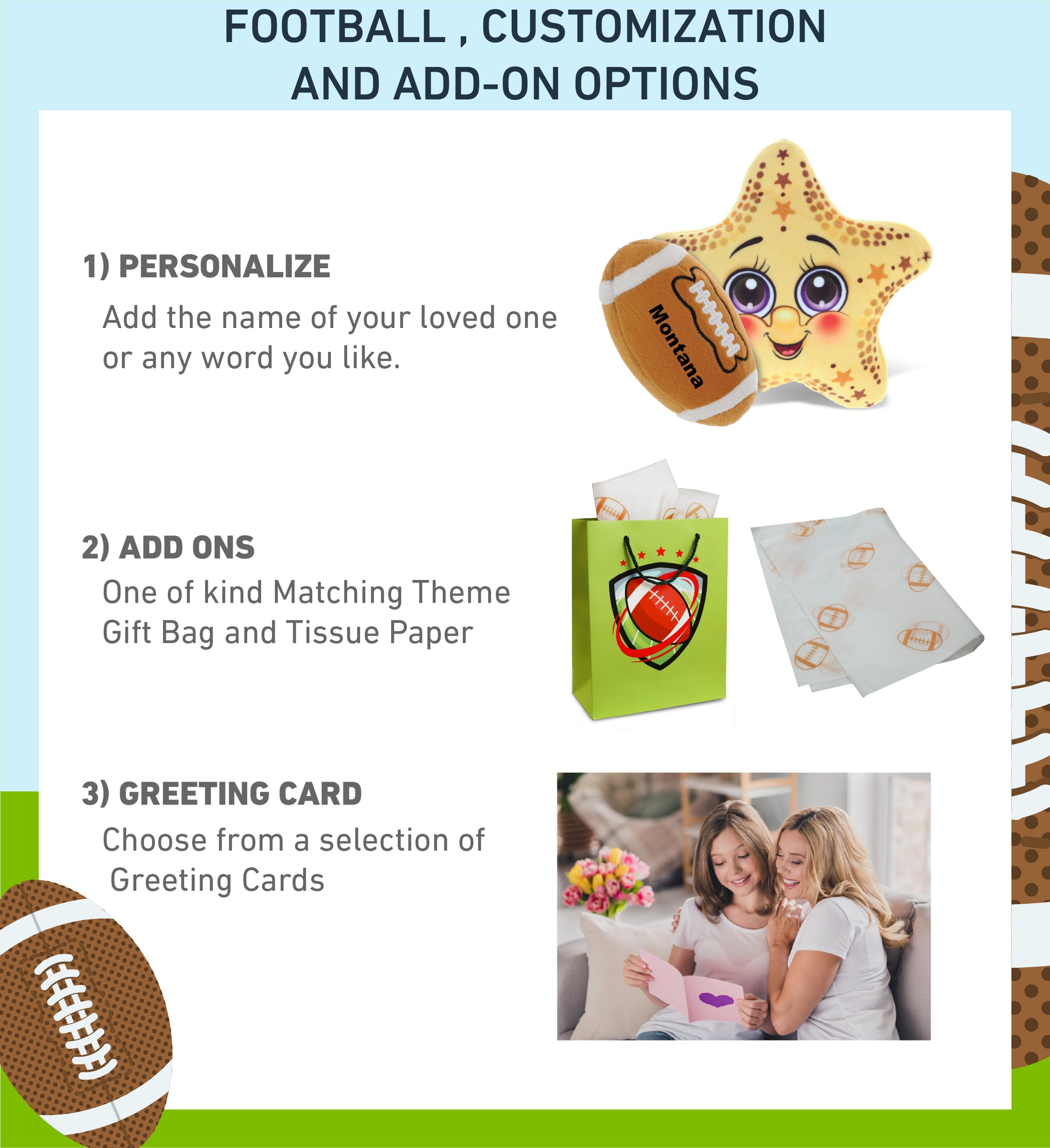 Personalization, Customization, and Add-On Options - Super Soft Sports Stuffed Animal Plush Buddies Starfish comes customized with a football plush. You can personalize it with the name of your loved one imprinted on the item. You also have the option to add some or all of the cool add-ons to make your gift extra special: 1) Gift Bag; 2) Tissue Paper; 3) Greeting Card.