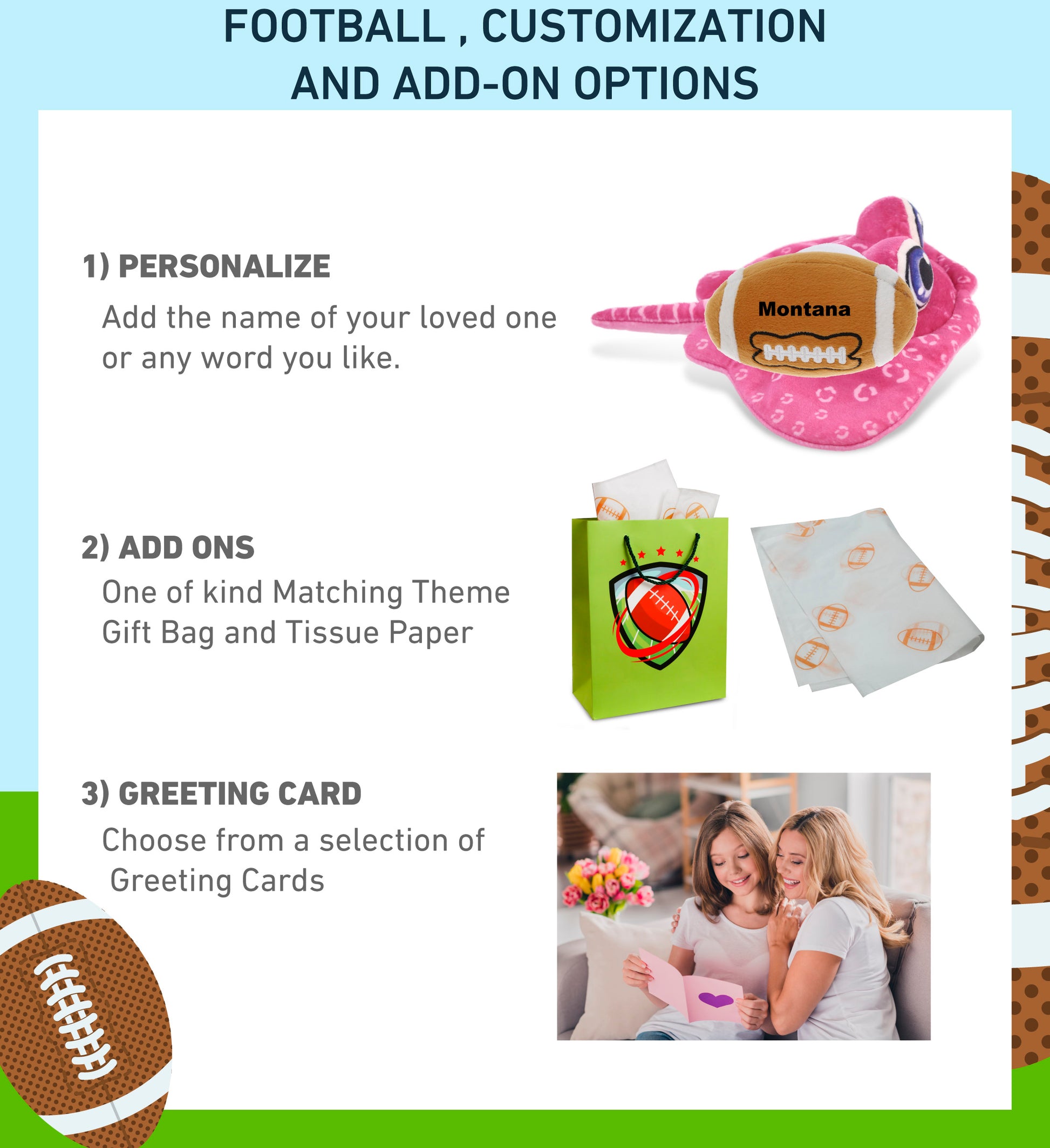 Personalization, Customization, and Add-On Options - Super Soft Sports Stuffed Animal Plush Buddies Pink Stingray comes customized with a football plush. You can personalize it with the name of your loved one imprinted on the item. You also have the option to add some or all of the cool add-ons to make your gift extra special: 1) Gift Bag; 2) Tissue Paper; 3) Greeting Card.