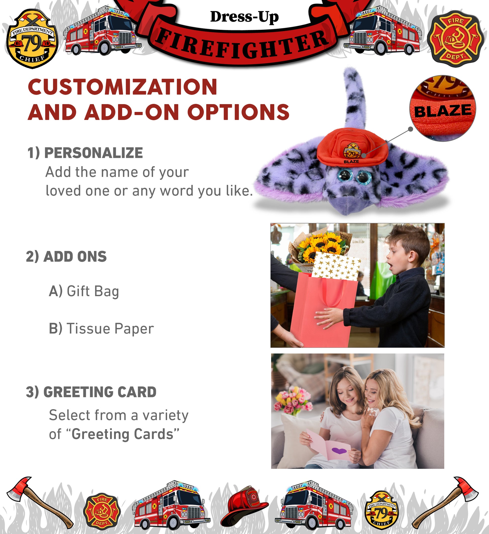 Personalization, Customization, And Add-On Options - Super Soft Purple Stingray firefighter plush features a red fireman toy costume wearing a firefighter hat. Personalize your plush firefighter toys with the name of your loved one, which we will imprint on the item. You also have the option to customize your fireman plush by adding some or all of our cool add-ons to make it extra special: 1) Gift Bag 2) Tissue Paper 3) Greeting Card.