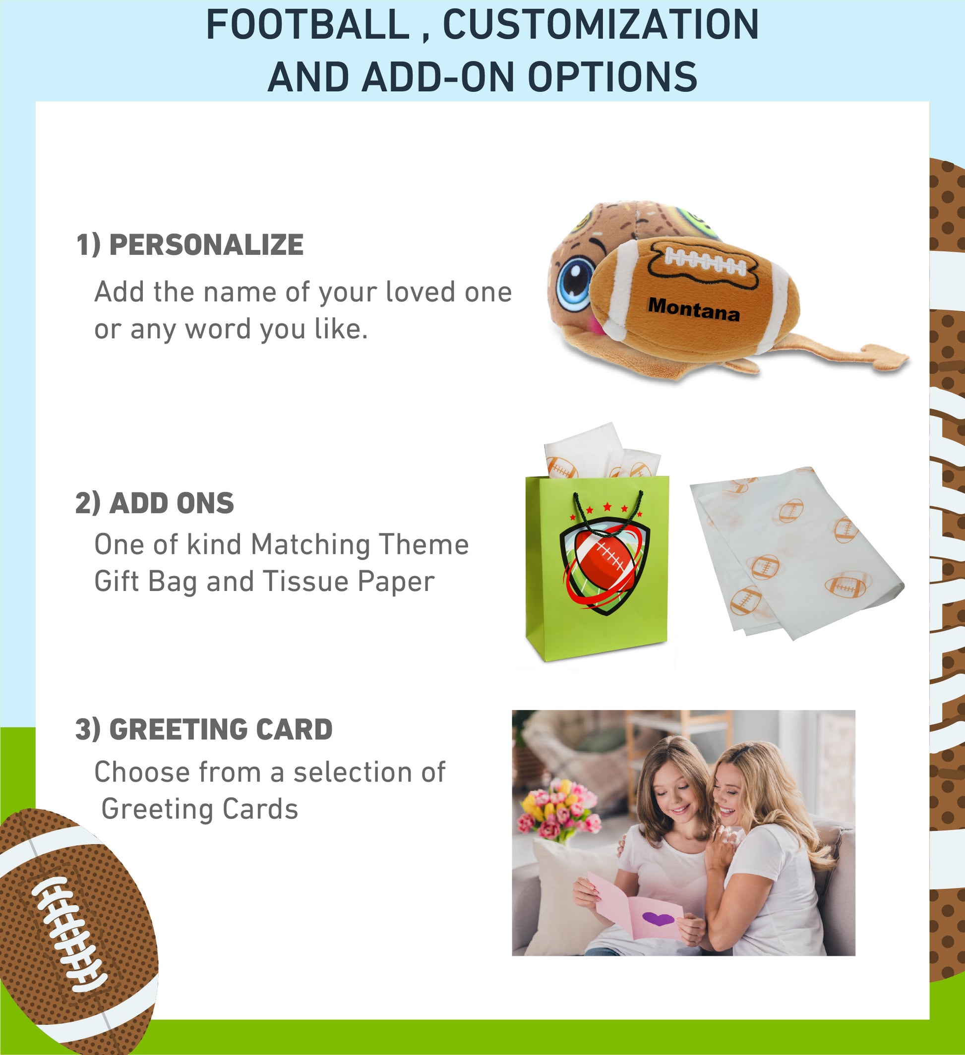 Personalization, Customization, and Add-On Options - Super Soft Sports Stuffed Animal Plush Buddies Stingray comes customized with a football plush. You can personalize it with the name of your loved one imprinted on the item. You also have the option to add some or all of the cool add-ons to make your gift extra special: 1) Gift Bag; 2) Tissue Paper; 3) Greeting Card.