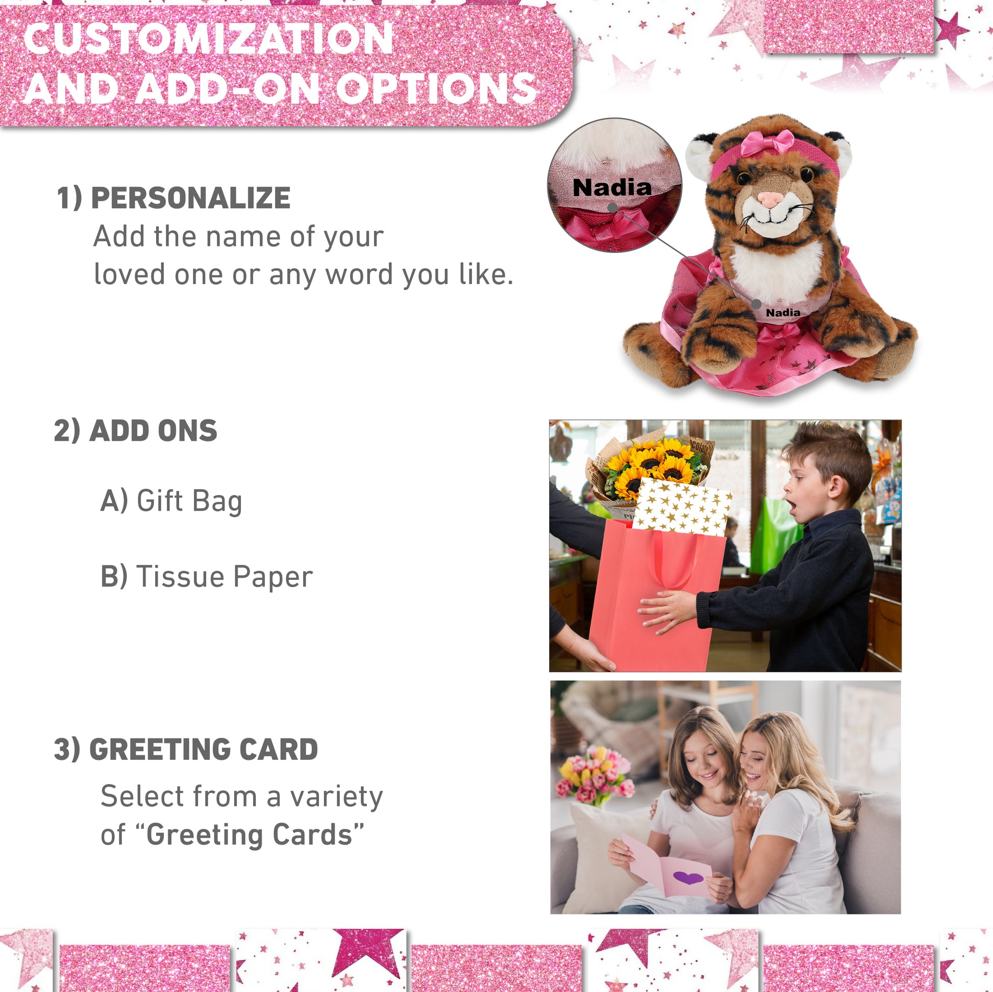 Personalization, Customization, and Add-On Options - The squat tiger plush toy comes dressed in a charming pink ballerina outfit, complete with tutu skirt, headband, and shirt. Make it meaningful by personalizing it with the name, which we will imprint directly onto the plush. You can also customize your ballerina tiger stuffed animal doll by adding any of our add-ons to create the perfect gift: 1) Gift Bag 2) Tissue Paper 3) Greeting Card.