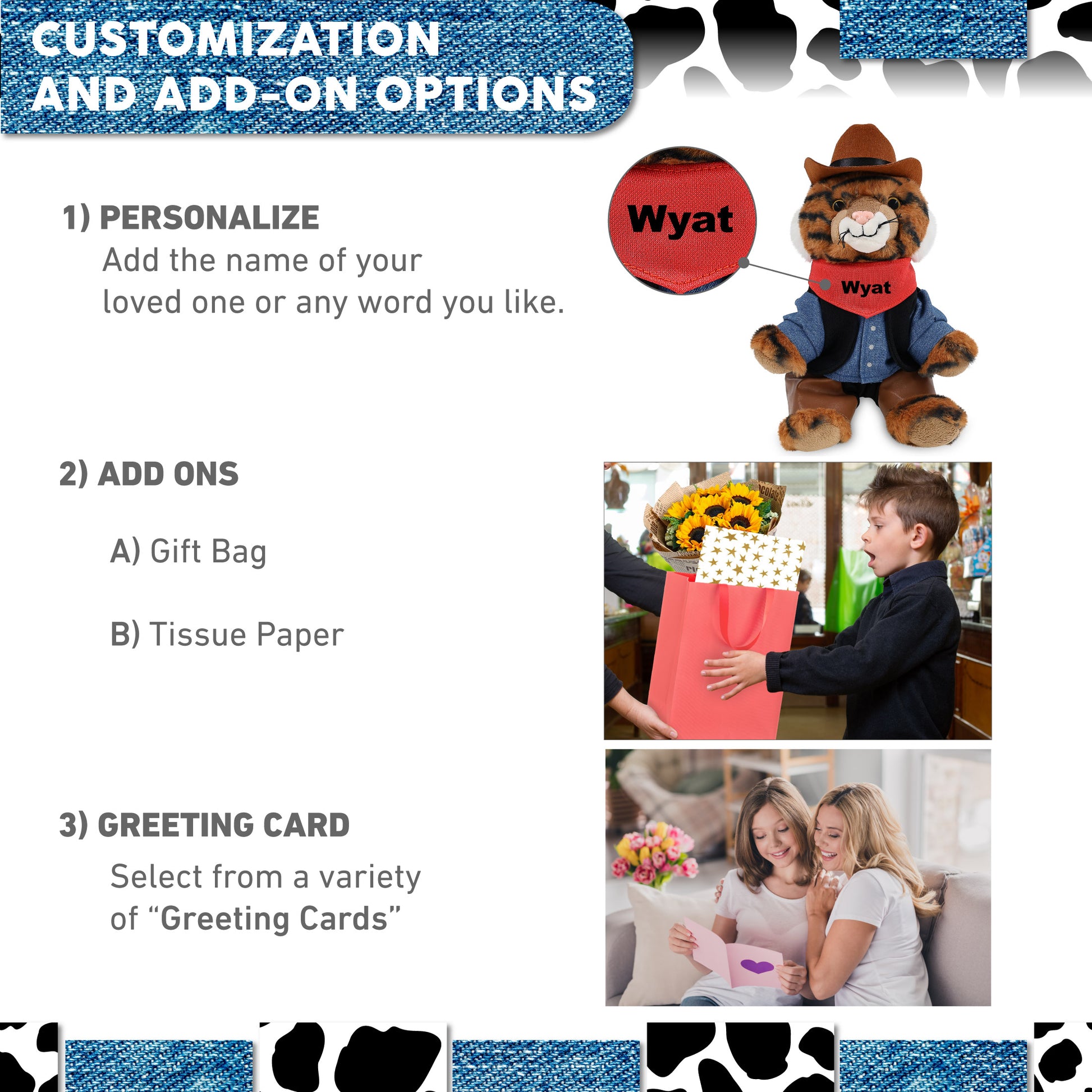 Personalization, Customization and Add-On Options - The tiger stuffed animal plush comes dressed in a cowboy outfit, complete with cowboy vest shirt, pants, bandana, and cowboy hat. Make it cool by personalizing it with the name, which we will imprint directly onto the stuffy plush. You can also customize your cowboy plush tiger by adding any of our add-ons to create the perfect gift: 1) Gift Bag 2) Tissue Paper 3) Greeting Card.