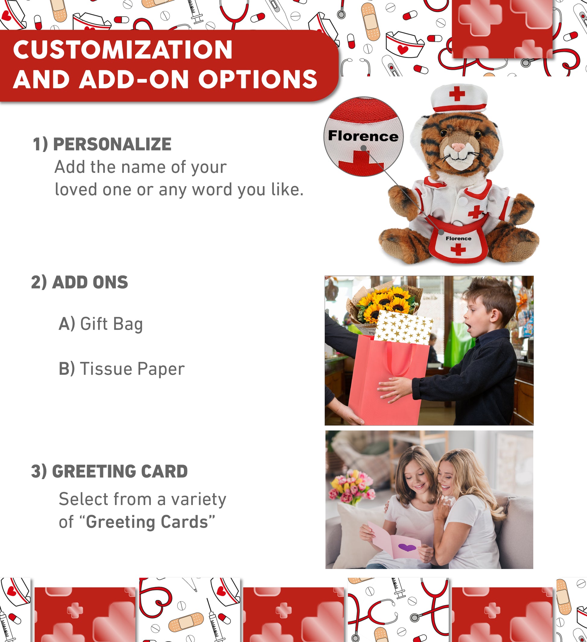 Personalization, Customization, and Add-On Options - The stuffed Tiger comes dressed in a cute nurse costume, complete with nurse cap, nurse dress and apron. Make your nurse teddy bear stuffed animal plush special by adding a personalized name, which we'll imprint onto the plush. You can also customize your nurse tiger plush by adding any of our add-ons to create the perfect gift: 1) Gift Bag 2) Tissue Paper 3) Greeting Card.