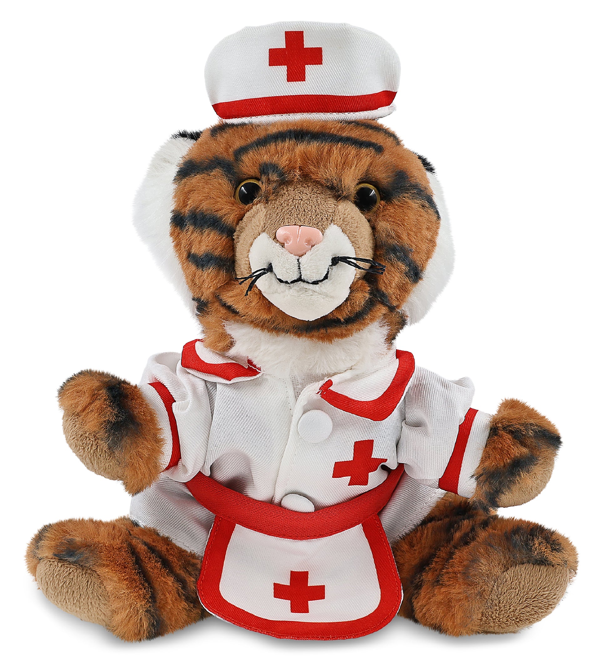 Squat Tiger with Nurse Stuffed Animal Clothes Features a Classic Nurse Outfit - Designed with red lining and a cross against the white nurse dress and the nurse cap and apron. The tiger stuffed animal plush has soft plush, perfect for everyday snuggles. This stuffed animal with clothes makes the perfect addition to your collection of tiger teddy bear with clothes or giveaway hospital toys to give to sick children.