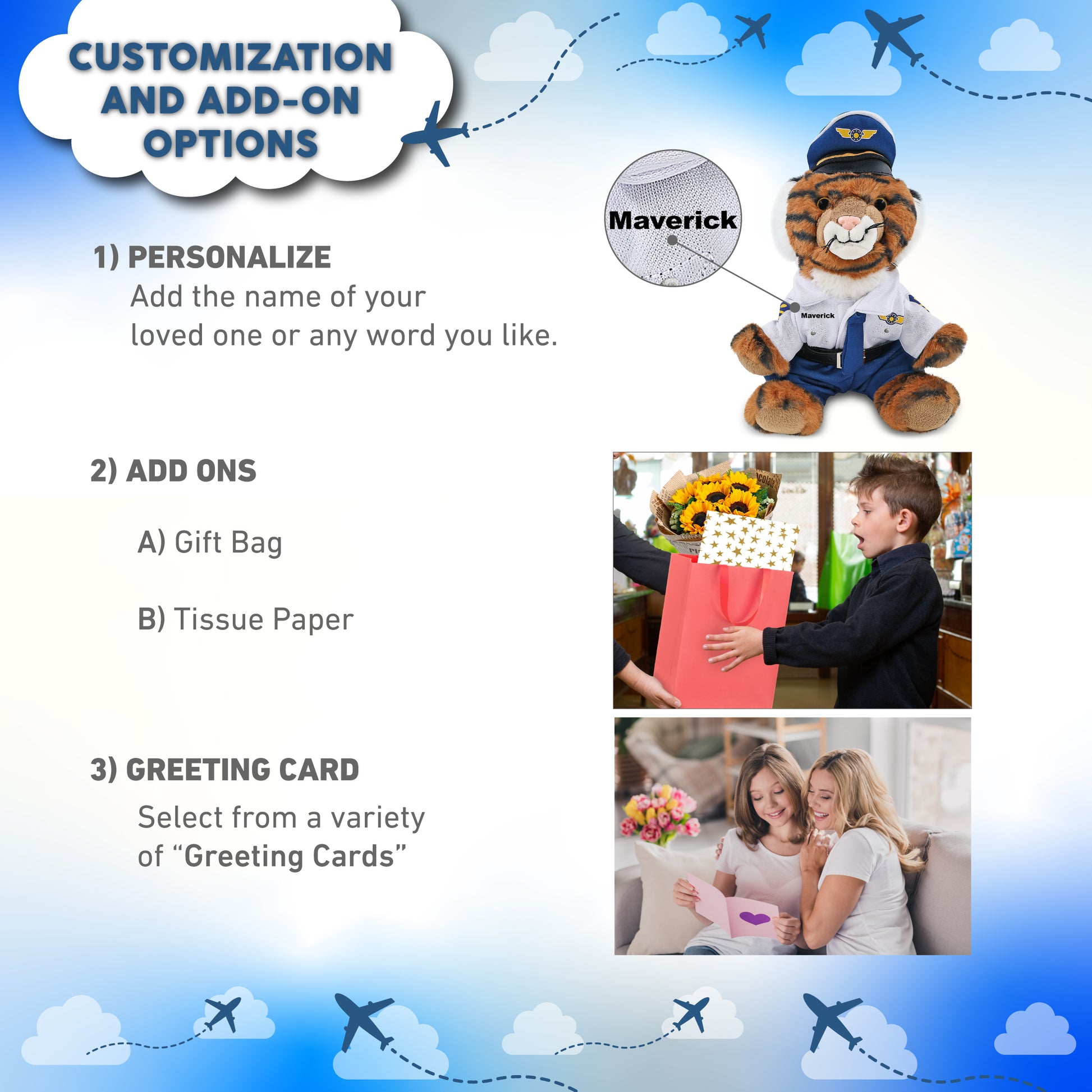 Personalization, Customization, and Add-On Options - The squat tiger stuffed animal comes dressed in a full pilot outfit set, with a white pilot shirt, captain hat, belt, and pants. Make your pilot stuffed bear special by adding a personalized name, which we will imprint onto the plush. You can customize your plush pilot toy by adding any of our add-ons to create the perfect gift: 1) Gift Bag 2) Tissue Paper 3) Greeting Card.