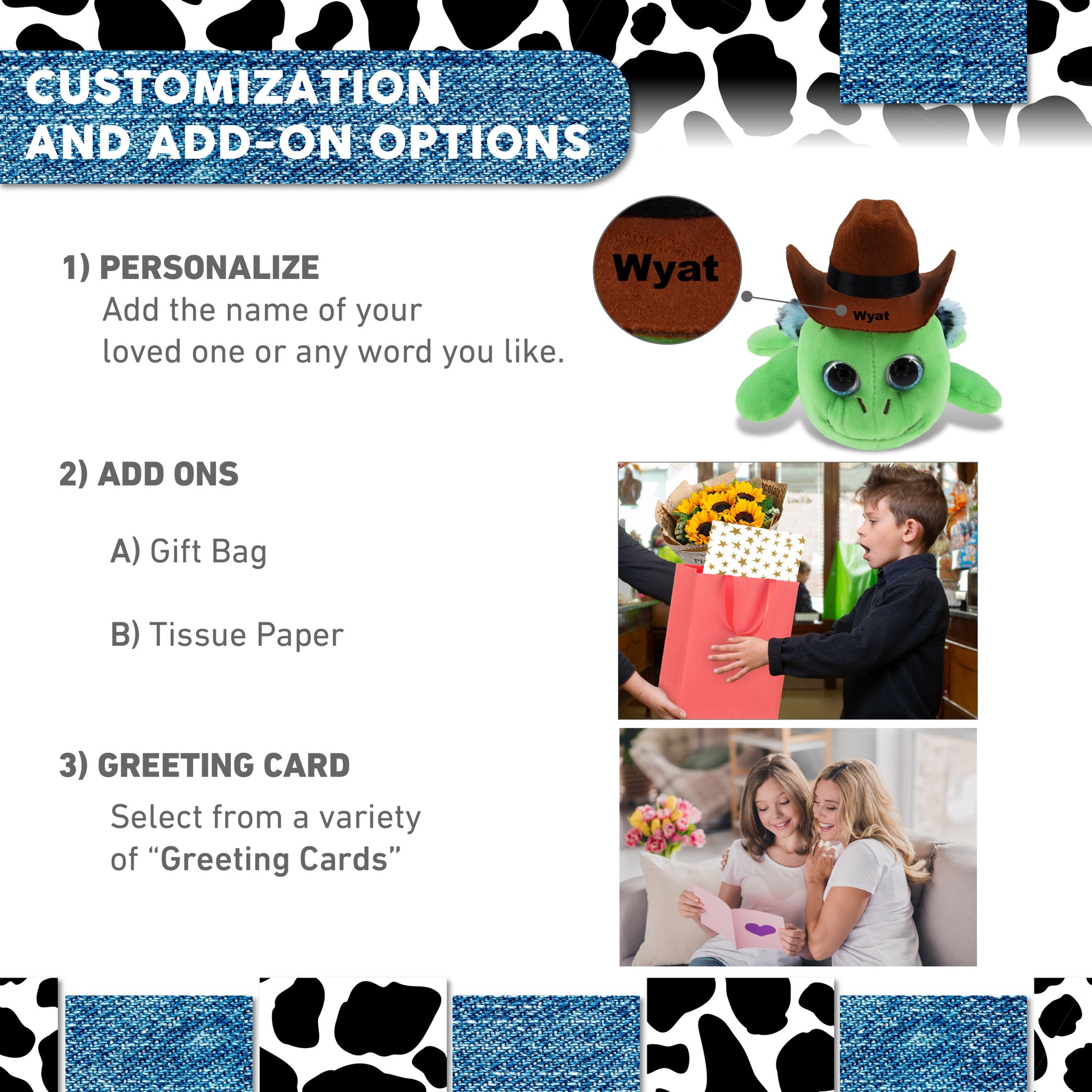 Personalization, Customization and Add-On Options - The sea turtle stuffed animal plush comes dressed with a cowboy hat. Make it cool by personalizing it with the name, which we will imprint directly onto the stuffy plush. You can also customize your cowboy plush sea turtle by adding any of our add-ons to create the perfect gift: 1) Gift Bag 2) Tissue Paper 3) Greeting Card.
