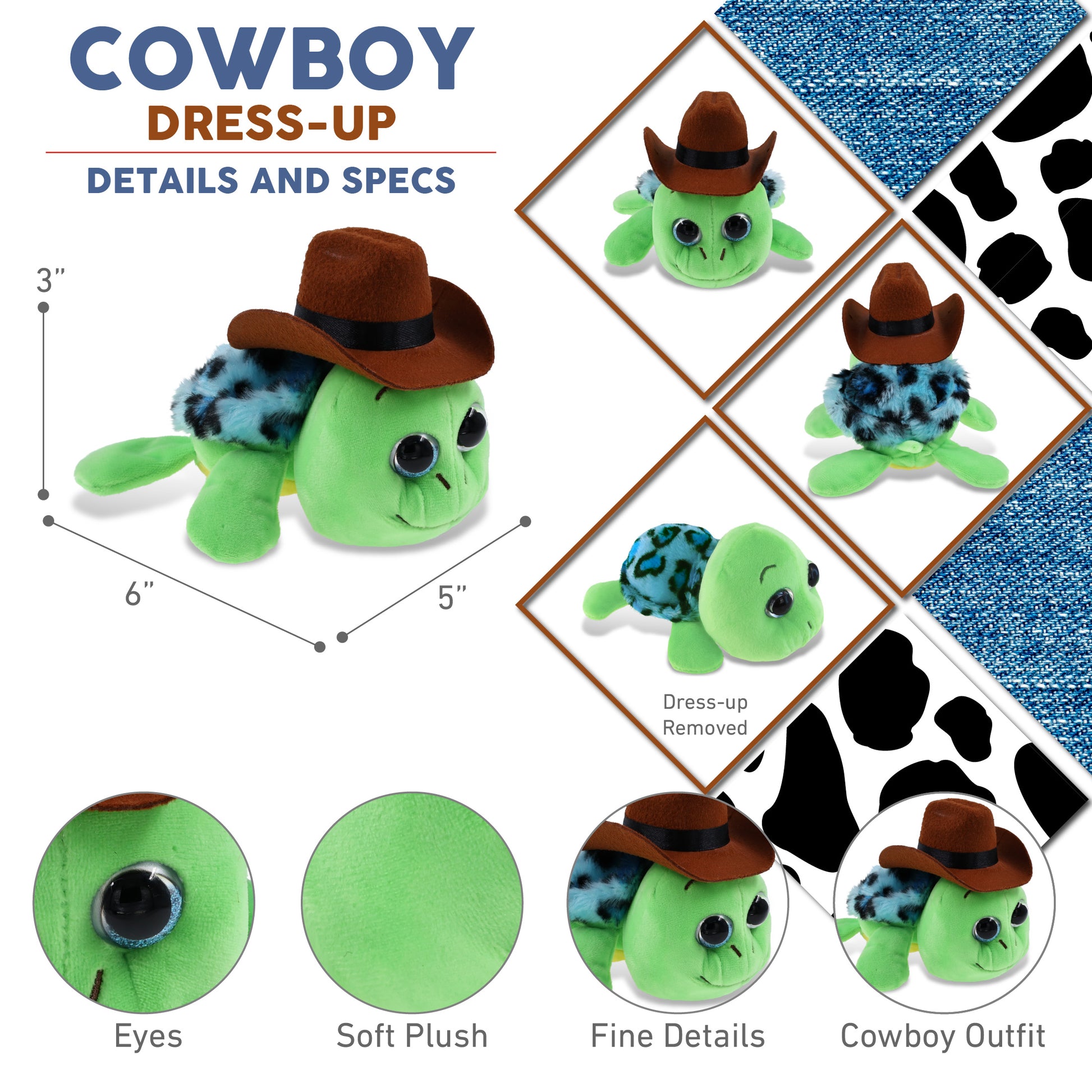 Includes 1 DolliBu Big Eye Blue Shell Sea Turtle Toy with Cowboy Dress Up Hat - This sea turtle plush arrives with western cowboy plush hat. The cute stuffed toy features a brown cowboy costume hat. Whether you collect adorable stuffed animals or gifts for cowboys with cowboy stuffed animal clothes and accessories, this teddy bear plush toy is the perfect cowboy gift. It measures 6Lx5Wx3H inches and is best for kids ages 3 and up.
