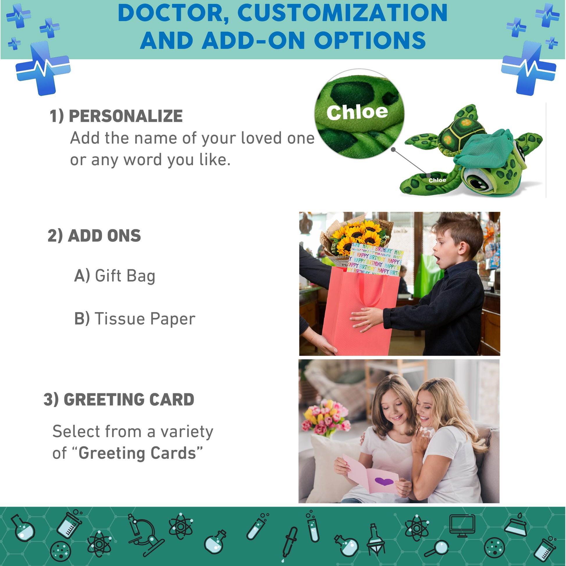Personalization, Customization, And Add-On Options - Super Soft Plush Buddies Green Sea Turtle Doctor Plush comes customized with a doctor's uniform scrub cap and face mask. You can personalize it with the name of your loved one imprinted on the item. You also have the option to add some or all of the cool add-ons to make your gift extra special: 1) Gift Bag; 2) Tissue Paper; 3) Greeting Card.