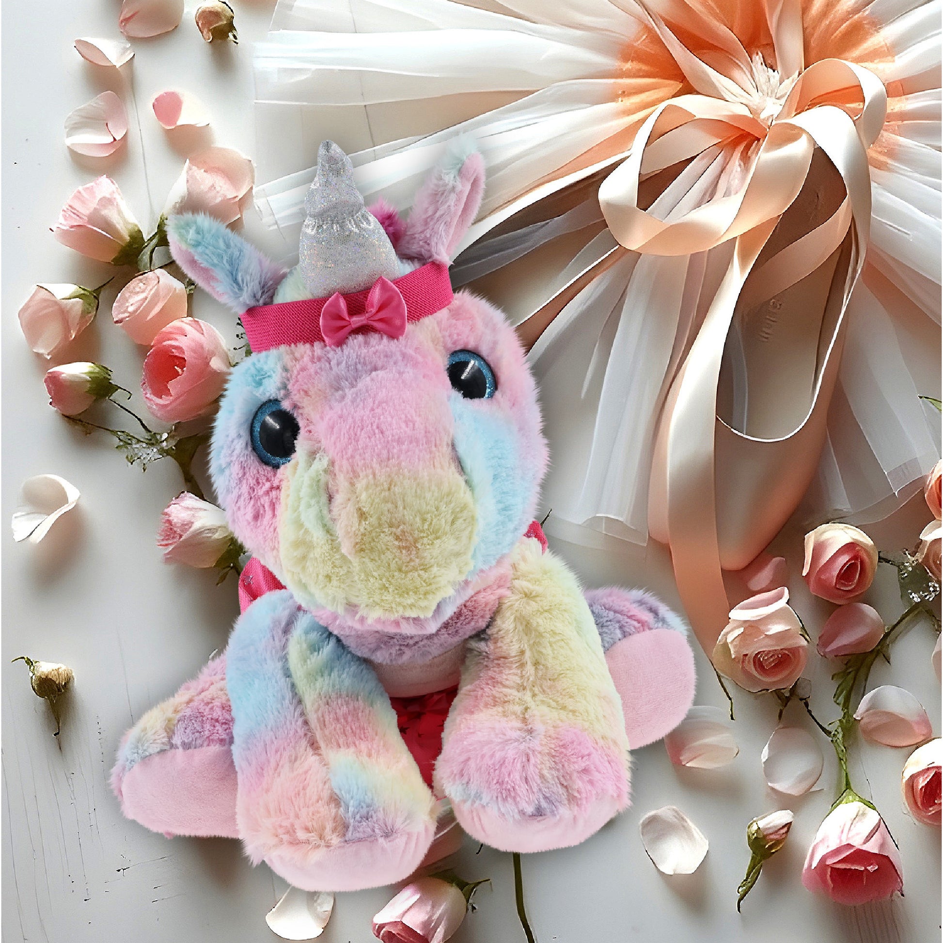 Whether you're into unicorn-themed toys or ballerina toys, this unicorn ballet stuffed animal for girls bridges both worlds. Ideal unicorn toys for kids and adults who love unicorn gifts and ballerina doll for girls 3-5 and up. Perfect addition to your display of ballerina dolls and ballerina decor and great ballet gift for your loved ones who love collecting cool unicorn stuff. This plush unicorn ballet toy features a unique combination of animals and ballet with its cute plush and adorable pink ballet clothes. The unicorn plush toy features a soft plush all over and a set of ballerina dress complete with a pink ribbon headband, tutu skirt, and a sleeveless top, making it one of the cute ballet dancer stuffed animal for everyone. The plush toy comes dressed in a charming pink ballerina outfit, complete with ballerina accessories; a tutu skirt, headband, and shirt. Make it meaningful by personalizing it with the name, which we will imprint directly onto the plush. You can also customize your ballerina unicorn doll by adding any of our add-ons to create the perfect gift: 1) Gift Bag 2) Tissue Paper 3) Greeting Card. The ballerina stuffed unicorn is crafted with premium-quality, soft, and durable material. Designed with fine stitching and details, the plush features a removable ballerina dance doll outfit, allowing kids to enjoy mix-and-match dress-up play. Perfectly built to withstand everyday play. Perfect unicorn-themed gifts for those who love collecting cute stuffed animals for teen girls or cool unicorn figures. Includes 1 DolliBu Floppy Rainbow Unicorn Toy with Ballet Outfit. The stuffed animal doll comes dressed in a cute ballerina doll plush outfit, complete with a pink headband with a bow, tutu skirt, and a sleeveless top. This unicorn ballerina toy is designed to be display-worthy and a cuddle plush for girls. This cute unicorn ballerina dancing doll measures approximately 12Lx11Wx12H inches and is best for kids ages 3 and up.