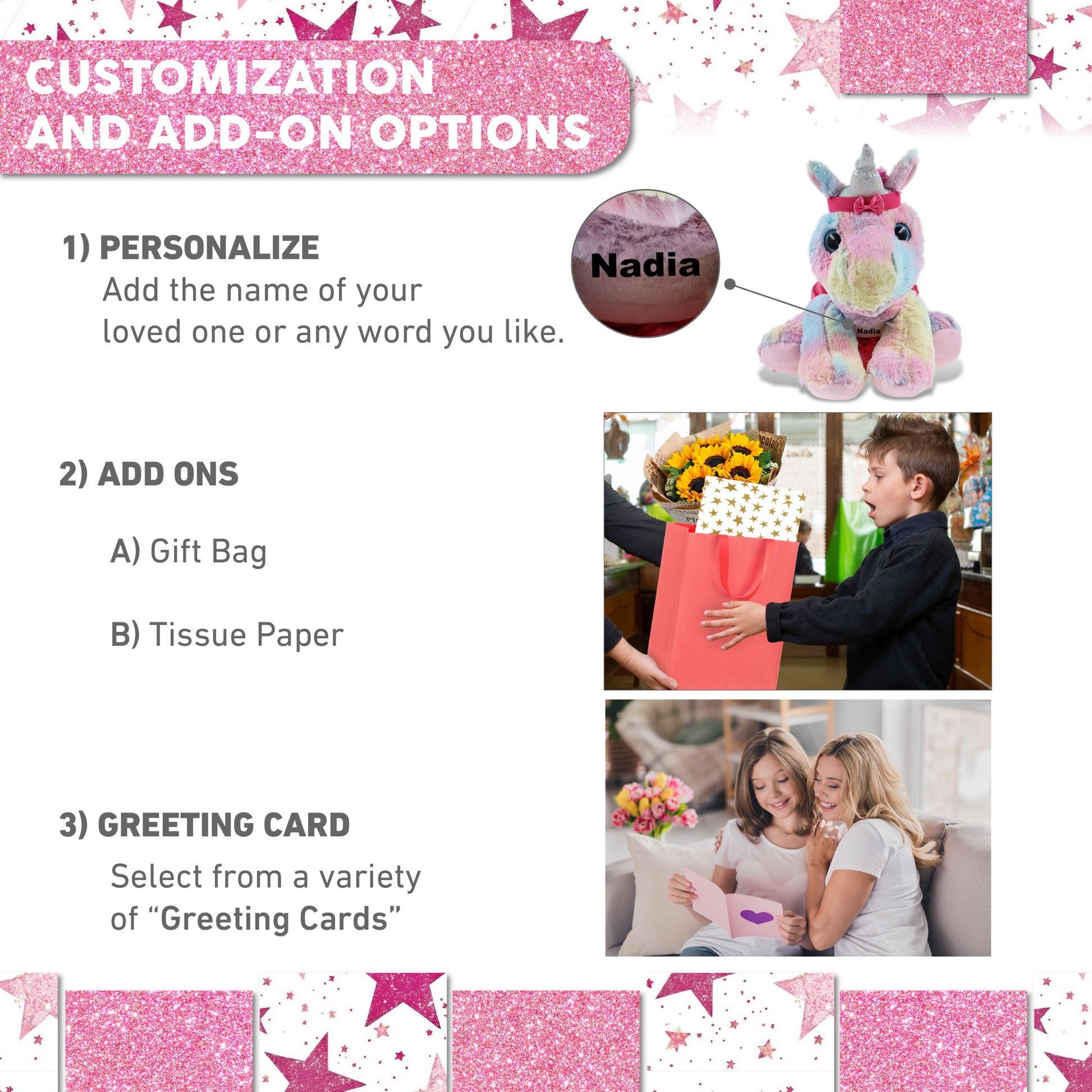 Personalization, Customization, and Add-On Options - The unicorn plush toy comes dressed in a charming pink ballerina outfit, complete with tutu skirt, headband, and shirt. Make it meaningful by personalizing it with the name, which we will imprint directly onto the plush. You can also customize your ballerina unicorn stuffed animal doll by adding any of our add-ons to create the perfect gift: 1) Gift Bag 2) Tissue Paper 3) Greeting Card.