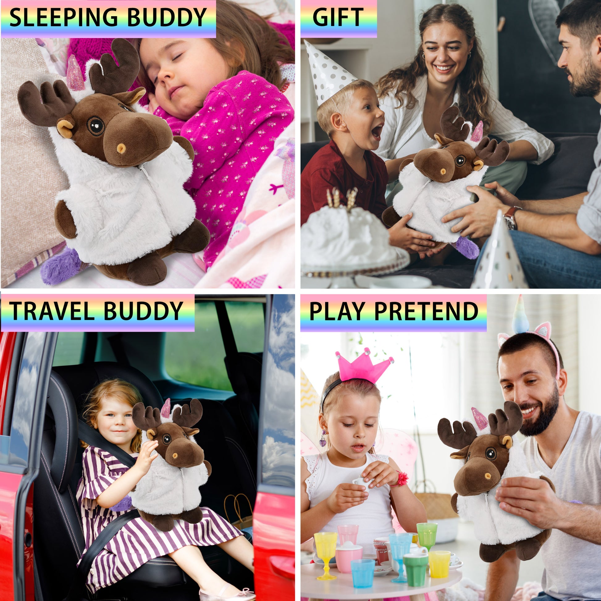 Ideal Use for The Unicorn Stuffed Toy Plush - Make your kid's day by surprising them with a Snug-Mooshies Standing Moose Unicorn Stuffed Animal! Fluffy and cute, the Unicorn Moose puts a twist on your usual unicorn plush and makes an amazing addition to your kids collection of unicorn-stuffed toys. Kids will love dressing up Moose Unicorn and playing pretend. This stuffed Unicorn dress-up plush toy makes a great sleeping and travel buddy.
