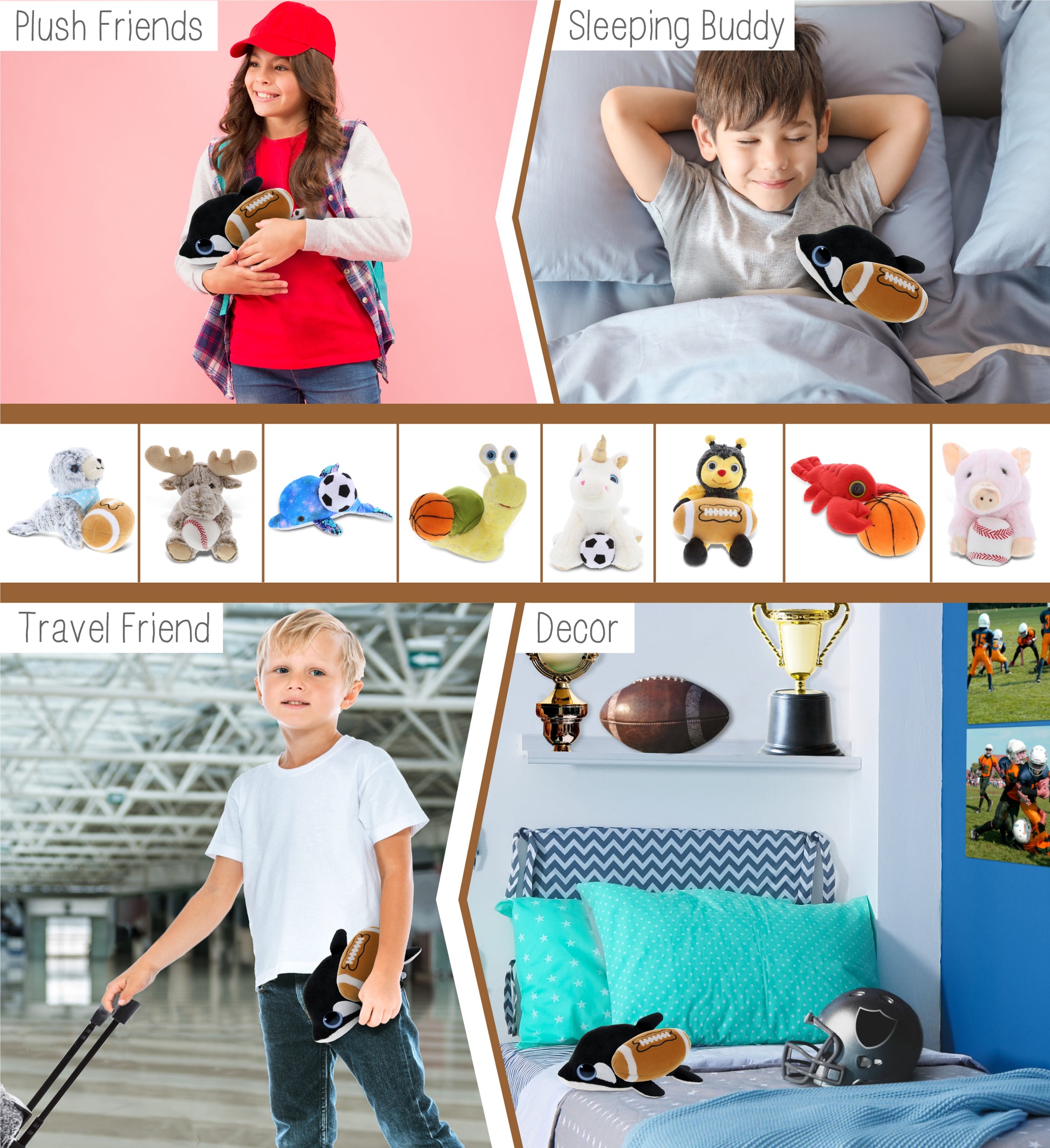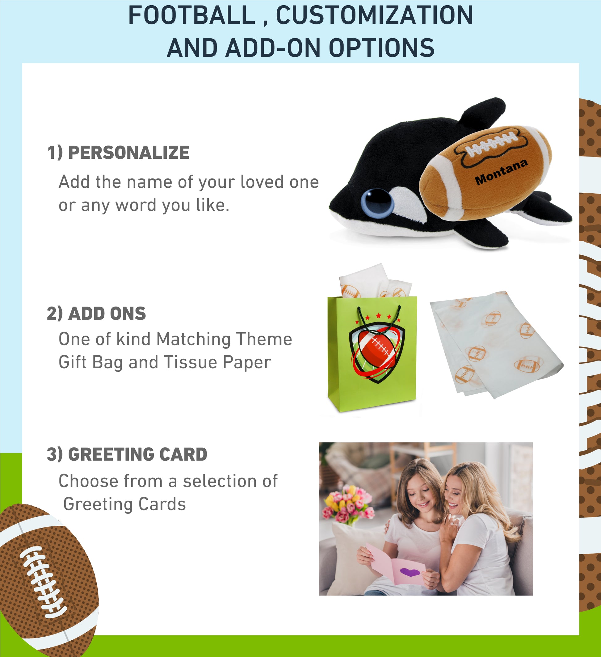 PERSONALIZATION, CUSTOMIZATION, AND ADD-ON OPTIONS - The Super Soft Sports Stuffed Animal Big Eye Killer Whale comes customized with a Football Plush. You can personalize your killer whale plush toy with the name of your loved one imprinted on the item. You also have the option to add some or all of the cool add-ons to make your gift extra special: 1) Gift Bag; 2) Tissue Paper; 3) Greeting Card.