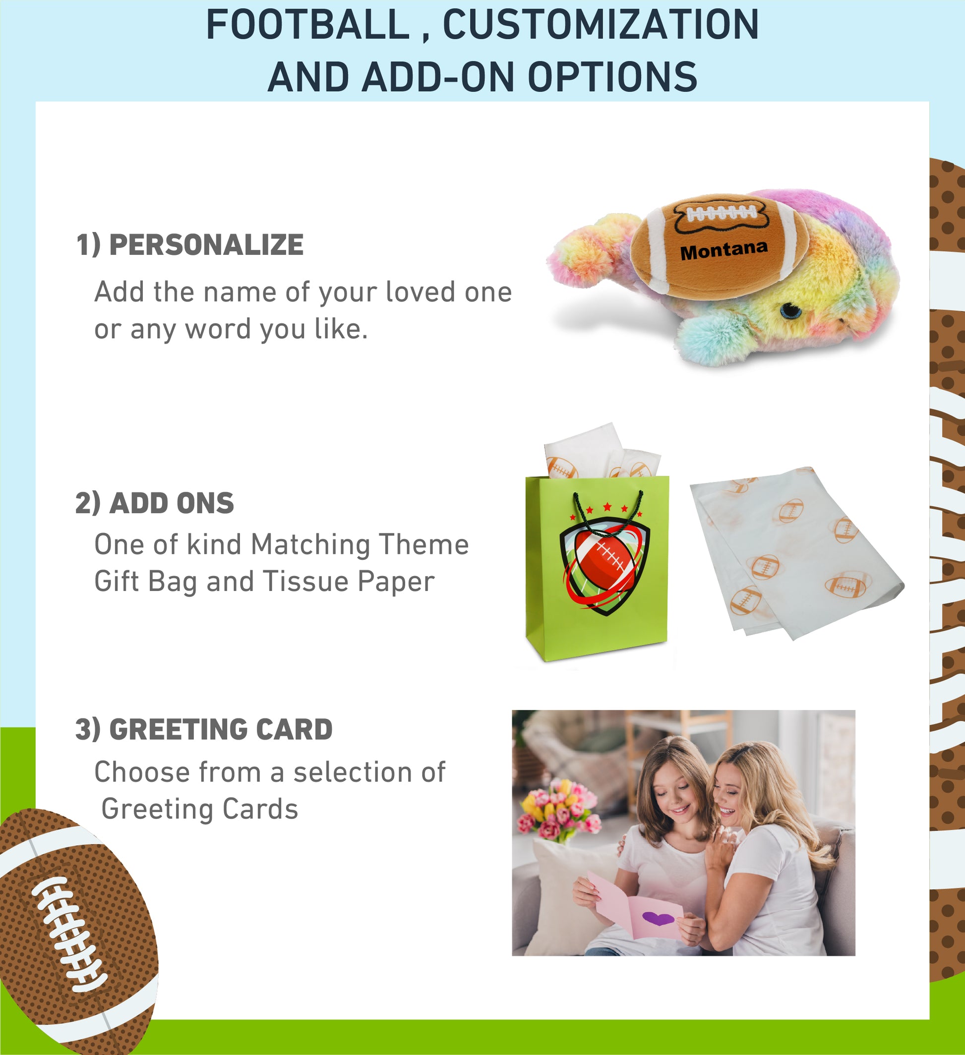 PERSONALIZATION, CUSTOMIZATION, AND ADD-ON OPTIONS - Super Soft Sports Stuffed Animal Small Rainbow Whale comes customized with a Football Plush. You can personalize it with the name of your loved one imprinted on the item. You also have the option to add some or all of the cool add-ons to make your gift extra special: 1) Gift Bag; 2) Tissue Paper; 3) Greeting Card.