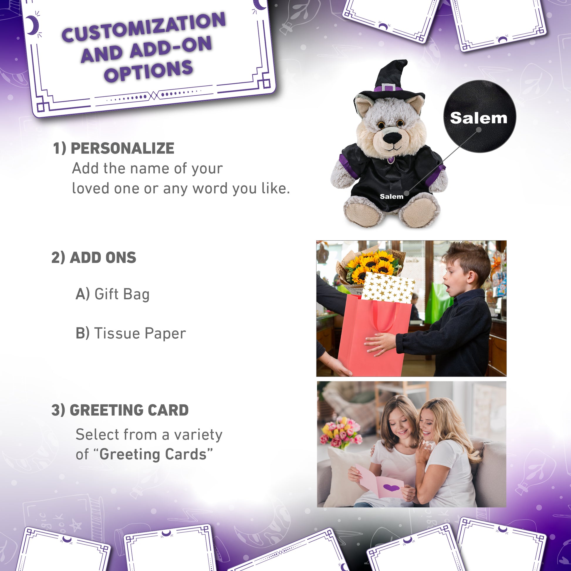 Personalization, Customization, and Add-On Options - The wolf Halloween plush toy comes dressed in a witch outfit, complete with black and purple cloak and pointy black witch hat. Make your teddy bear doll special by adding a personalized name, which we will imprint onto the plush. You can also customize your witch wolf stuffed animal by adding any of our add-ons to create the perfect gift: 1) Gift Bag 2) Tissue Paper 3) Greeting Card.