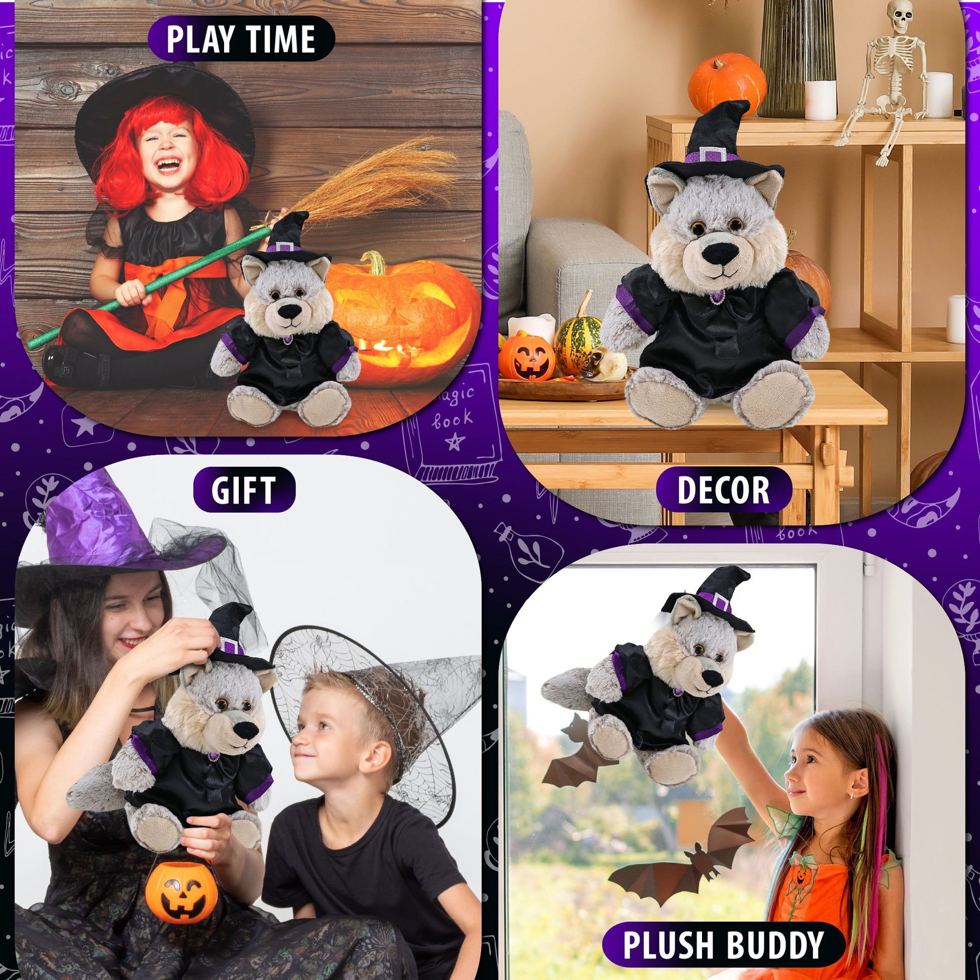 Perfect for Those Who Love Spooky Stuffed Animals - Everyone who loves spooky stuff and witch toys for girls and boys will be thrilled to get this sitting wolf stuffed animal with witch plush clothes. Perfect addition to your Halloween decor or as a spooky gift. Ideal Halloween themed gifts for fans of cute plush toys dressed up in clothes to dress and undress with a cute Halloween costume. Recommended for ages 3 and up.