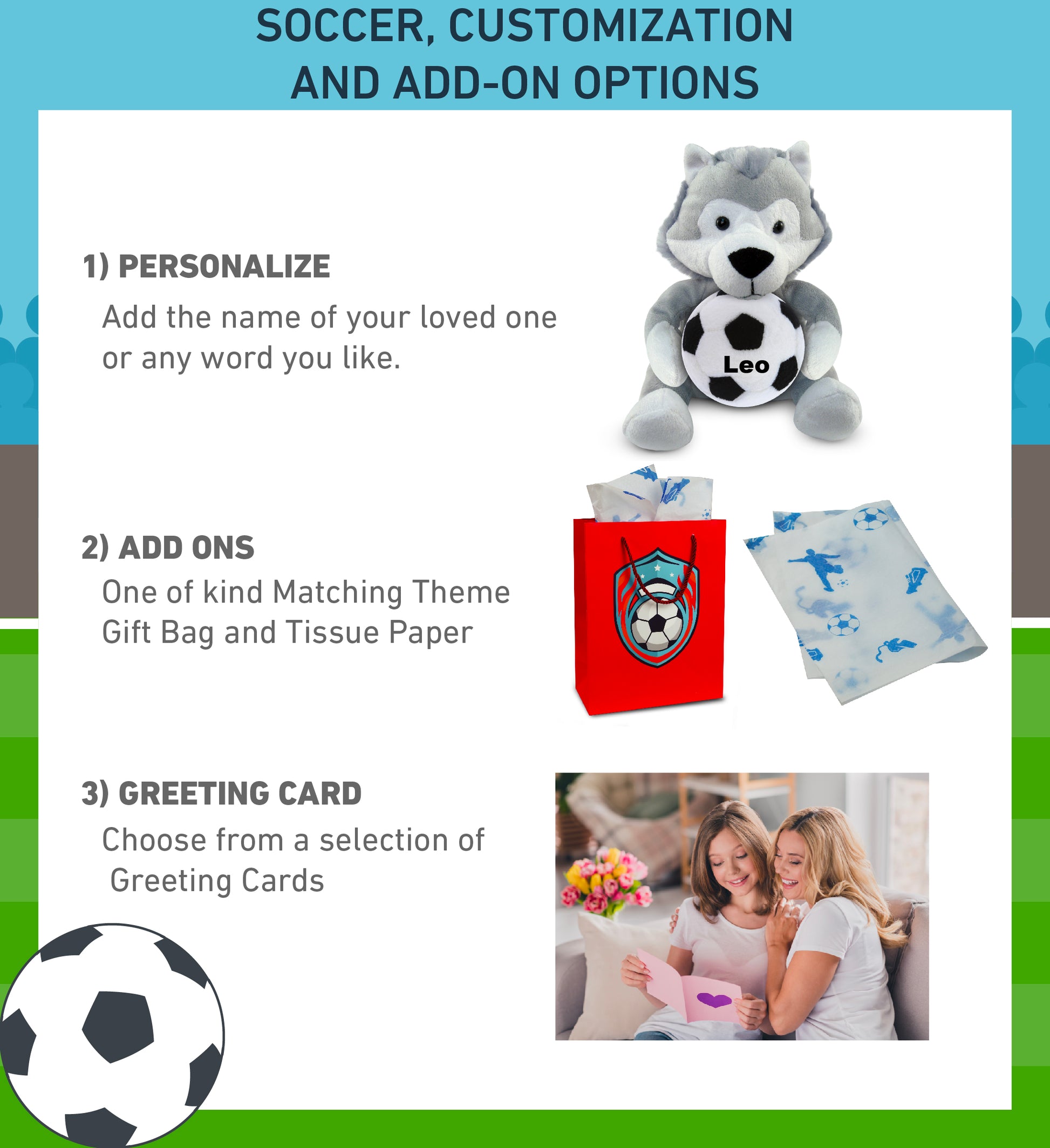 PERSONALIZATION, CUSTOMIZATION, AND ADD-ON OPTIONS - Super Soft Sports Stuffed Animal Wolf comes customized with a Soccer Ball Plush. You can personalize it with the name of your loved one imprinted on the item. You also have the option to add some or all of the cool add-ons to make your gift extra special: 1) Gift Bag; 2) Tissue Paper; 3) Greeting Card.