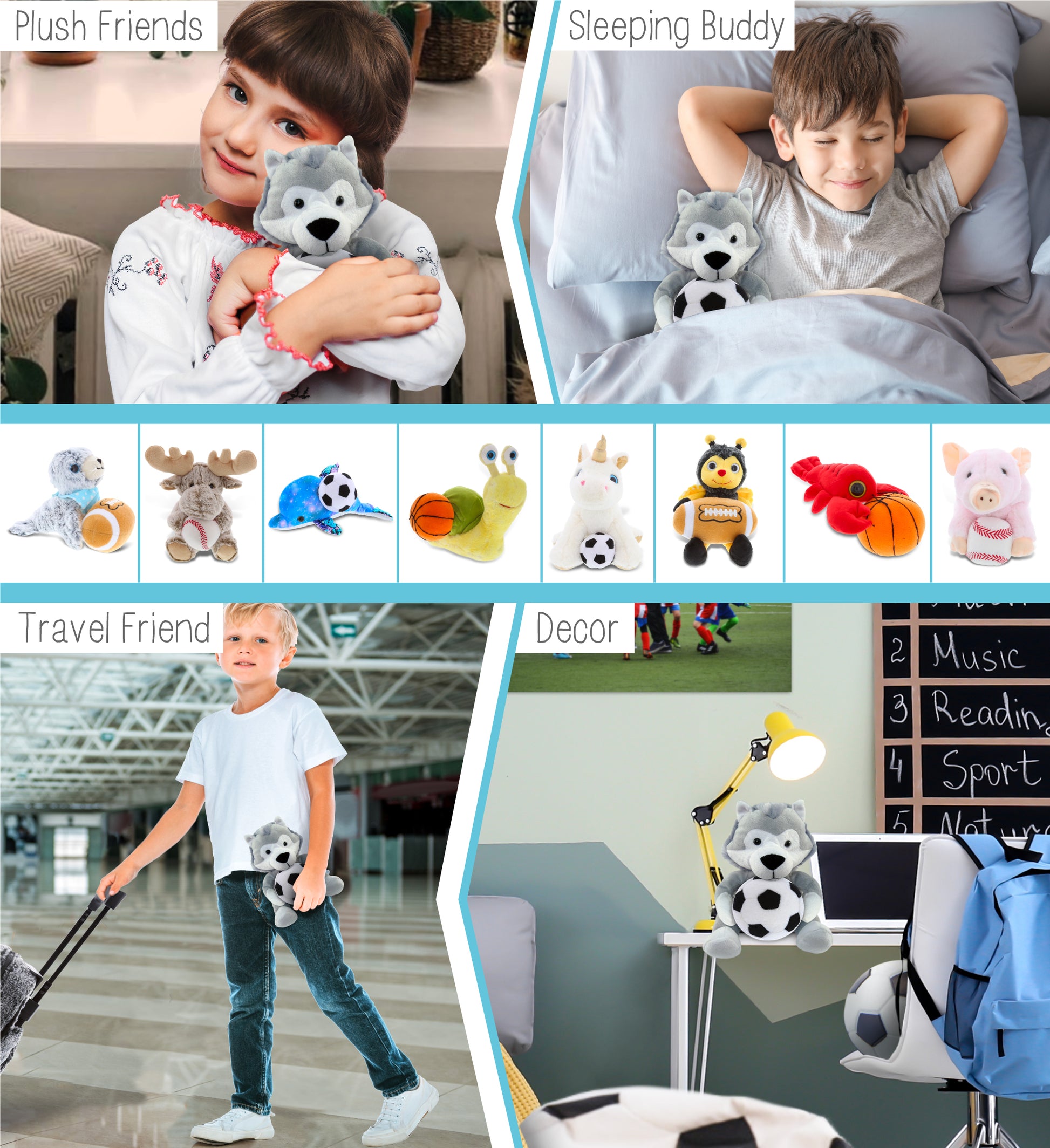 HIGH QUALITY SUPER SOFT PLUSH STUFFED ANIMAL - The machine-sewn wolf toy plush and soccer ball is made of premium-quality polyester, stuffed with soft fluffy polyester fillings. Made with durable and child-friendly features. Cute and snuggly wolf sitting down upright. Cute soft toys designed to be your little one's best buddies. To maintain fluffy stuffed animals, wash wolf plush toys with cold soapy water and allow it to air dry.
