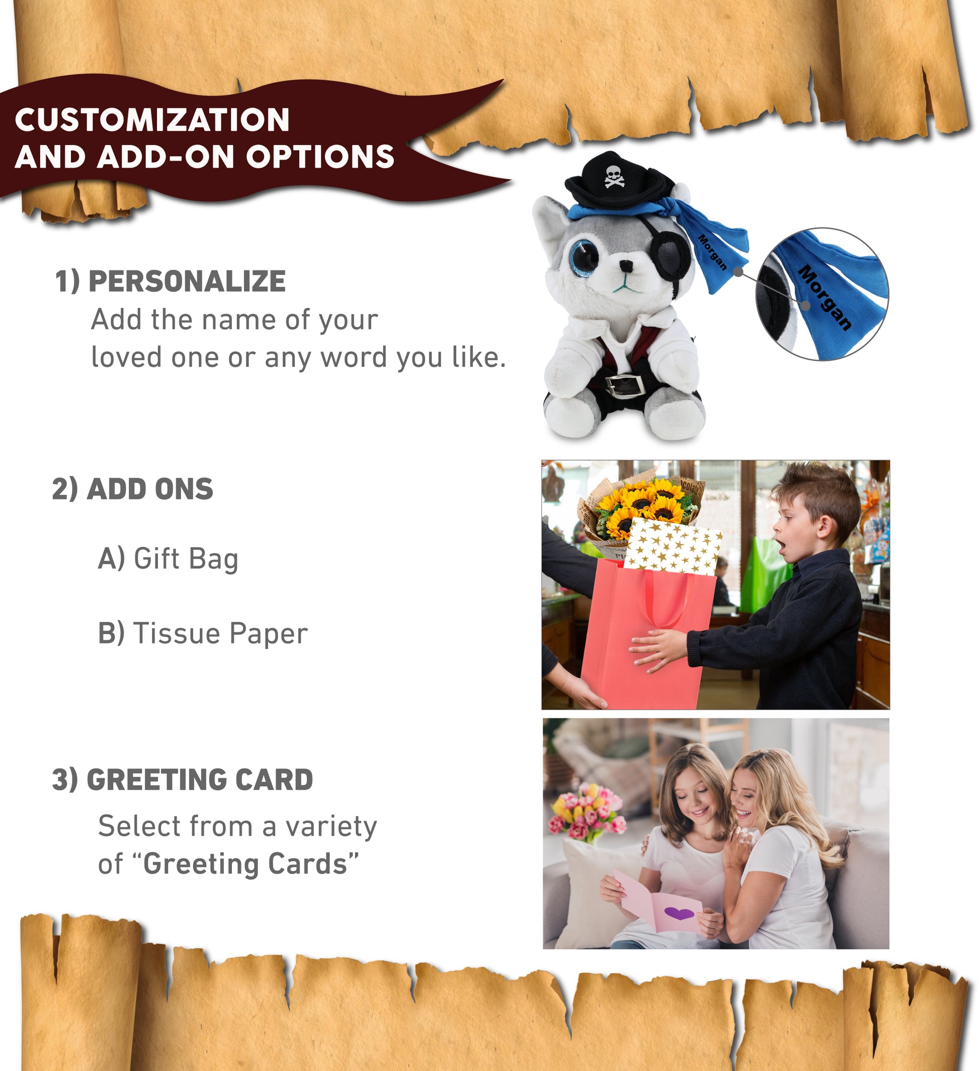 - Personalization, Customization, and Add-On Options - The wolf figure stuffed toy comes dressed in full pirate clothes, complete with pirate hat, pirate vest, pirate shirt, pants, belt, and pirate mask. Make your bear doll special by adding a personalized name, which we will imprint onto the plush. You can also customize your stuffed animal by adding any of our add-ons to create the perfect gift: 1) Gift Bag 2) Tissue Paper 3) Greeting Card.