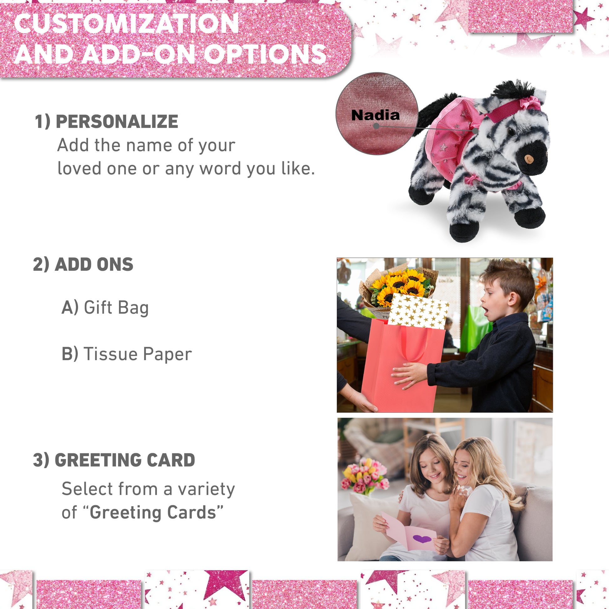 Personalization, Customization, and Add-On Options - The zebra plush toy comes dressed in a charming pink ballerina outfit, complete with tutu skirt, headband, and shirt. Make it meaningful by personalizing it with the name, which we will imprint directly onto the plush. You can also customize your ballerina zebra stuffed animal doll by adding any of our add-ons to create the perfect gift: 1) Gift Bag 2) Tissue Paper 3) Greeting Card.
