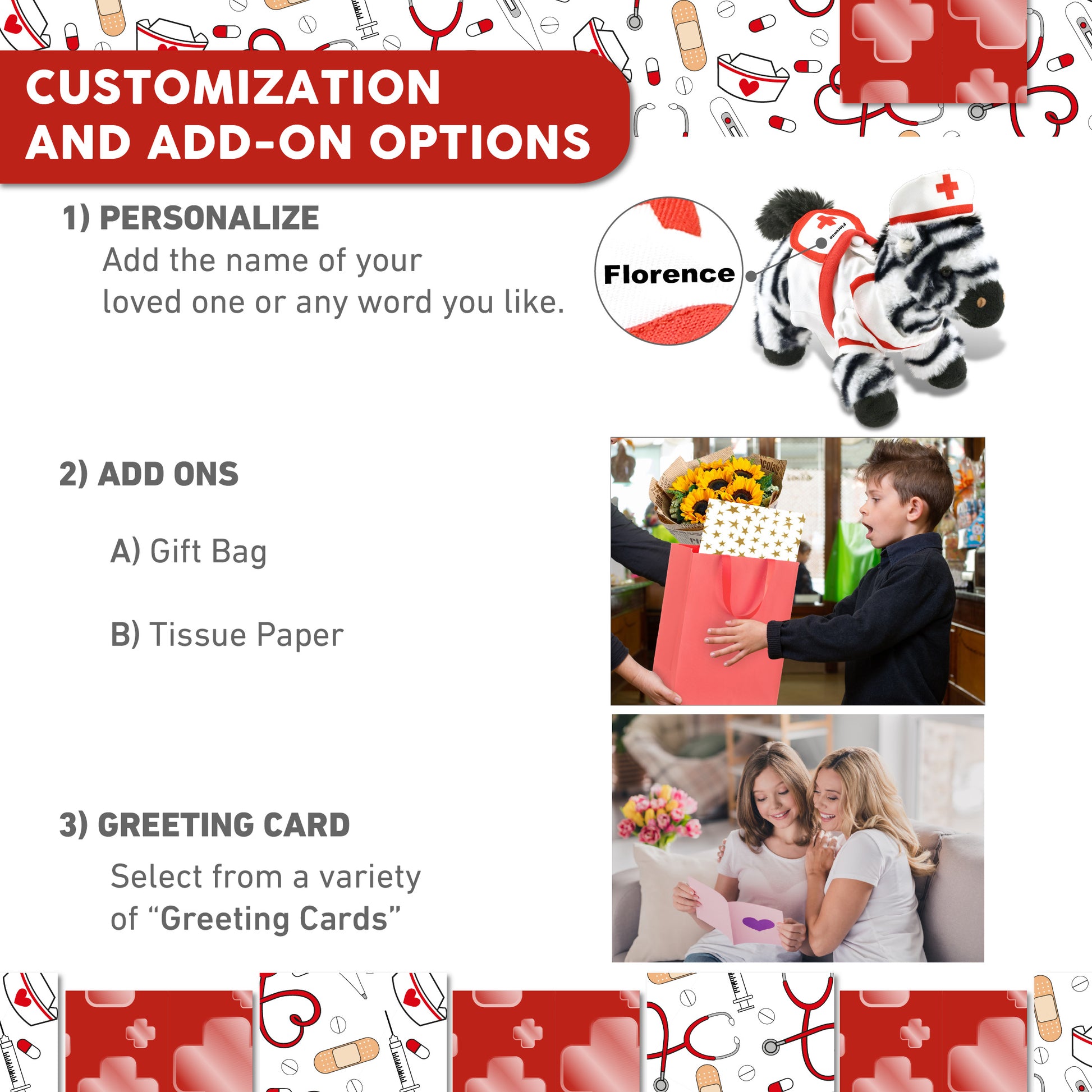 Personalization, Customization, and Add-On Options - The stuffed zebra comes dressed in a cute nurse costume, complete with nurse cap, nurse dress and apron. Make your nurse zebra stuffed animal plush special by adding a personalized name, which we'll imprint onto the plush. You can also customize your nurse zebra plush by adding any of our add-ons to create the perfect gift: 1) Gift Bag 2) Tissue Paper 3) Greeting Card.