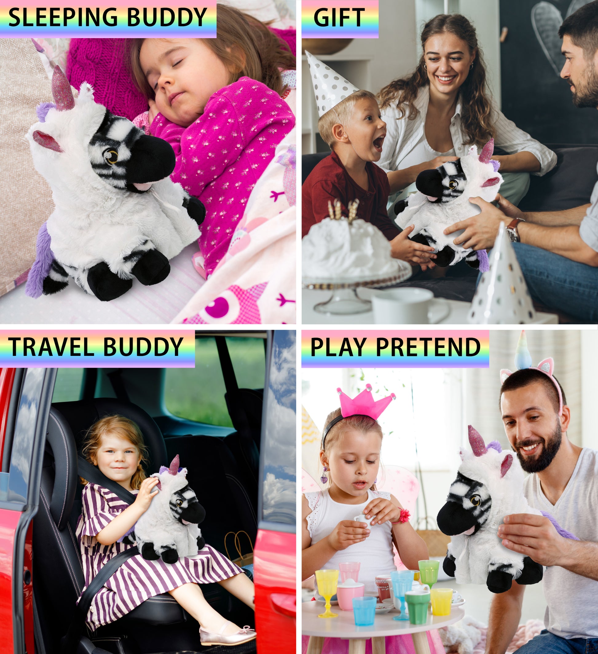 Ideal Use for The Unicorn Stuffed Toy Plush - Make your kid's day by surprising them with an Eco-Friendly Zebra Unicorn Stuffed Animal! Fluffy and cute, the Unicorn Zebra puts a twist on your usual unicorn plush and makes an amazing addition to your kids collection of unicorn-stuffed toys. Kids will love dressing up Zebra Unicorn and playing pretend. This stuffed Unicorn dress-up plush toy makes a great sleeping and travel buddy.