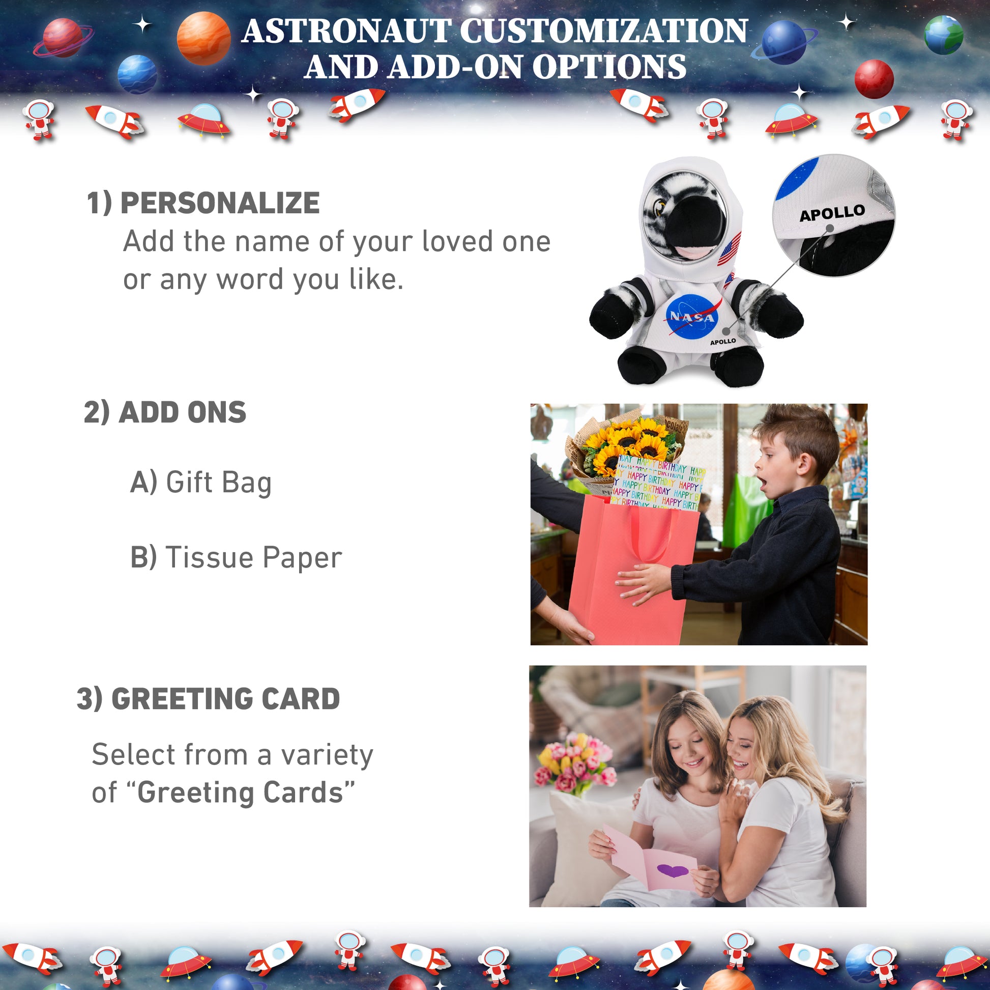 Personalization, Customization, And Add-On Options - The Eco-Friendly Zebra features an Astronaut outfit, with a space helmet and a NASA astronaut outfit with a printed USA flag. Personalize it by adding the name of your loved one, which we will imprint on the item. You also have the option to customize your astronaut plush by adding some or all of our cool add-ons to make it extra special: 1) Gift Bag 2) Tissue Paper 3) Greeting Card.